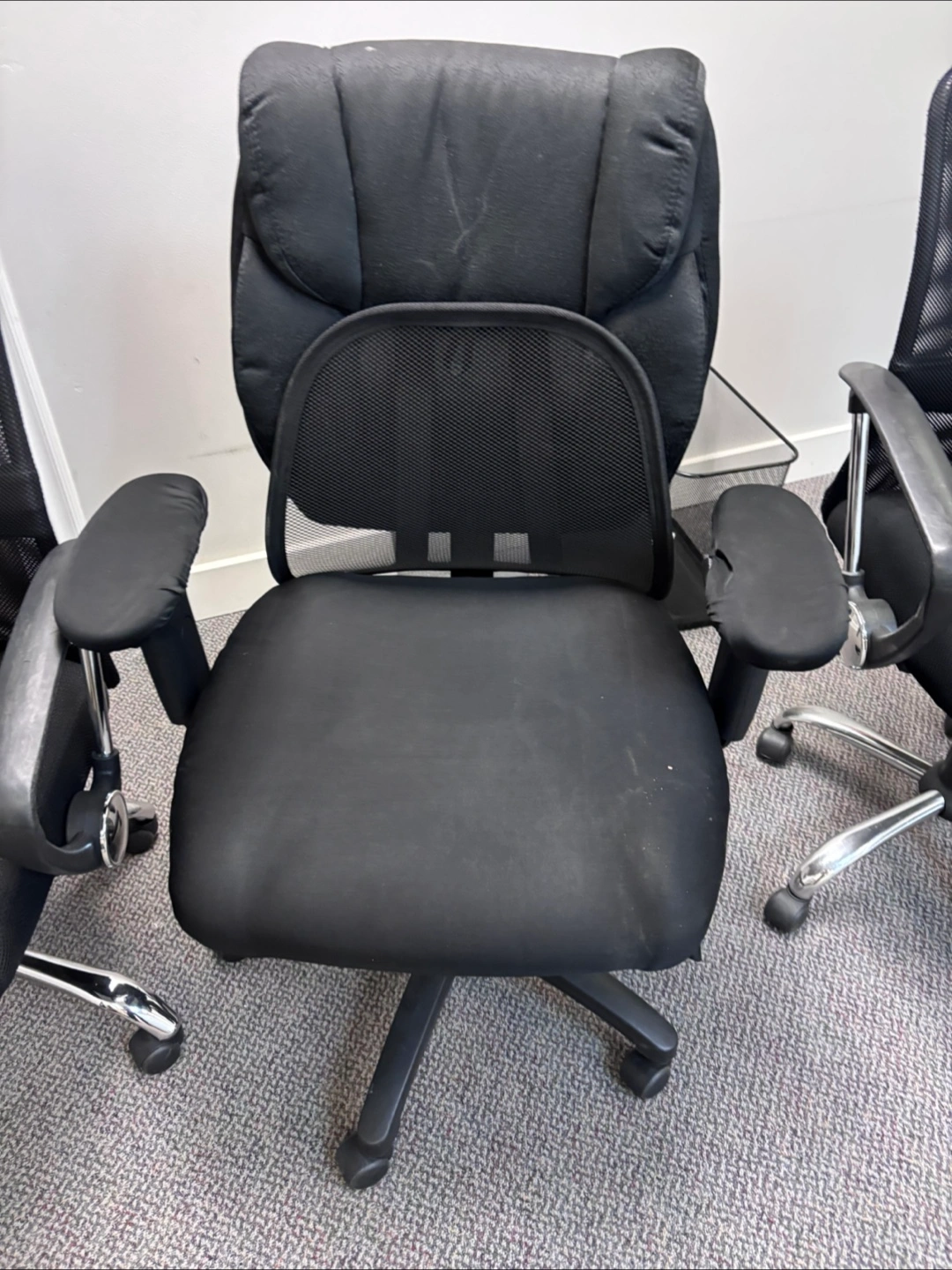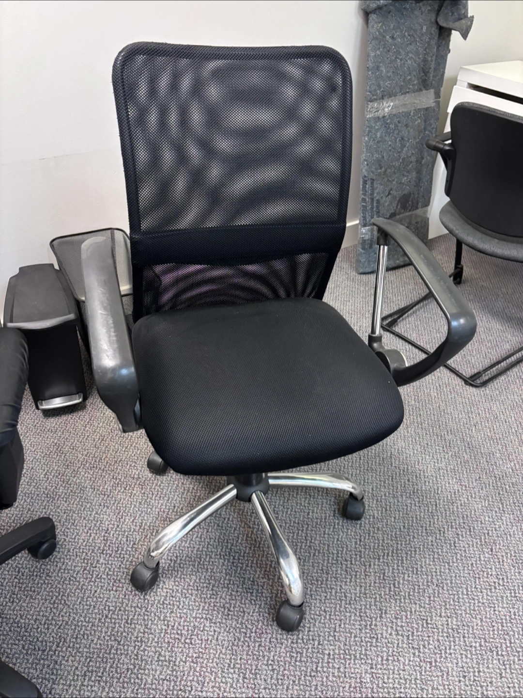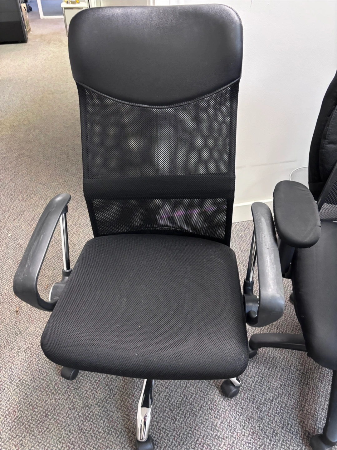 Selling a black office chair, perfect for your home or office. It has a mesh back and adjustable armrests. It's in good condition and ready to use!