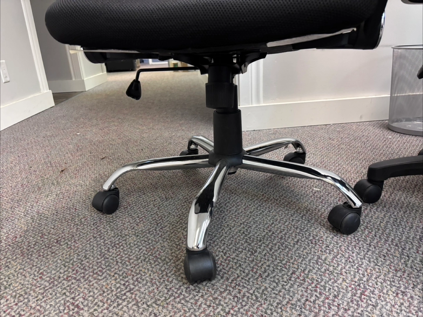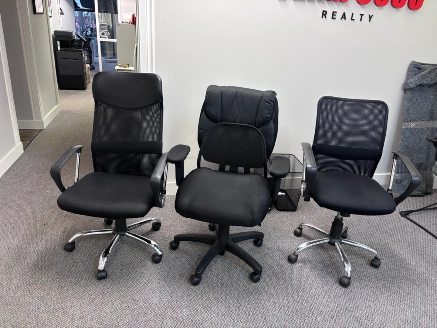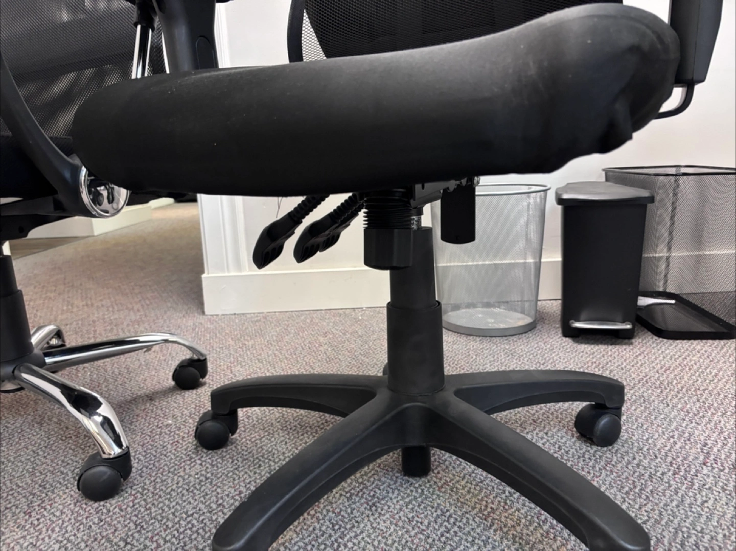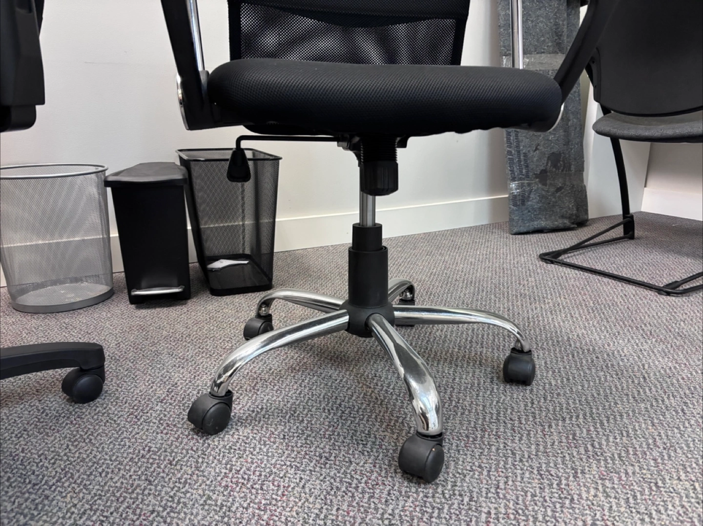 Selling a black office chair, perfect for your home or office. It has a mesh back and adjustable armrests. It's in good condition and ready to use!