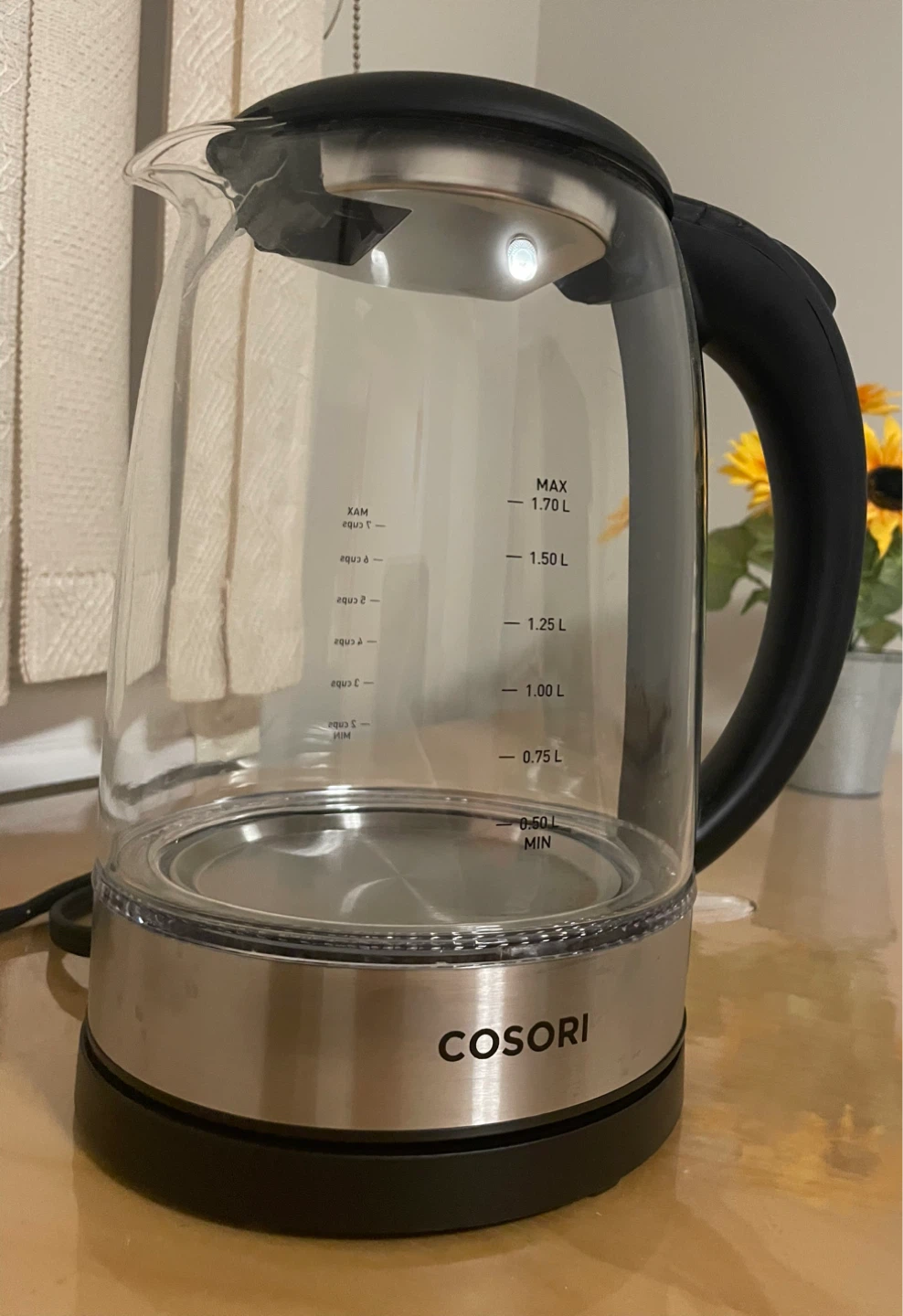 Selling a Cosori electric kettle in excellent condition! It has a 1.7L capacity and a clear glass body so you can easily see how much water is inside. Perfect for tea, coffee, or instant noodles!