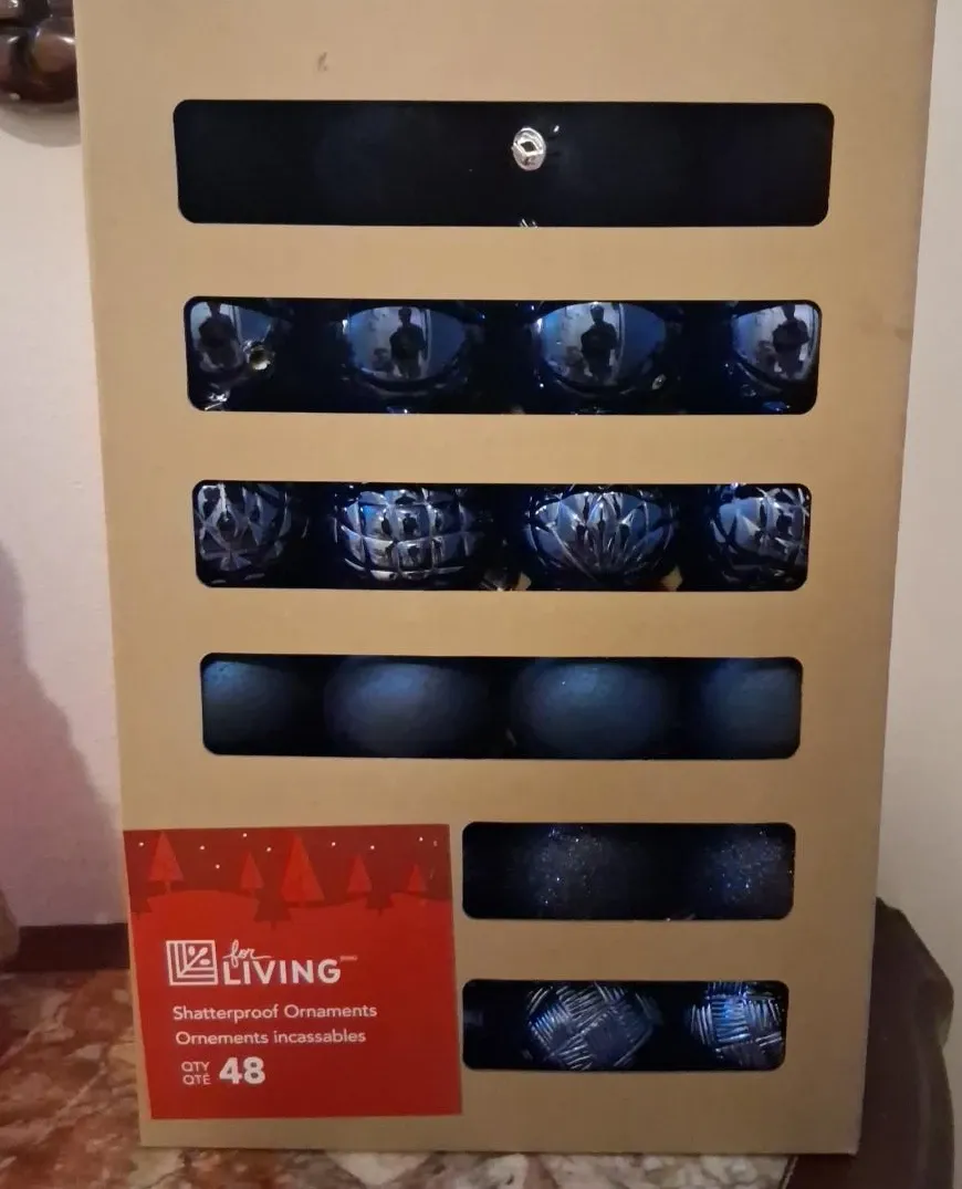 Selling a box of 48 shatterproof ornaments from For Living. These are a lovely blue colour and come in a variety of textures and designs. Box included!