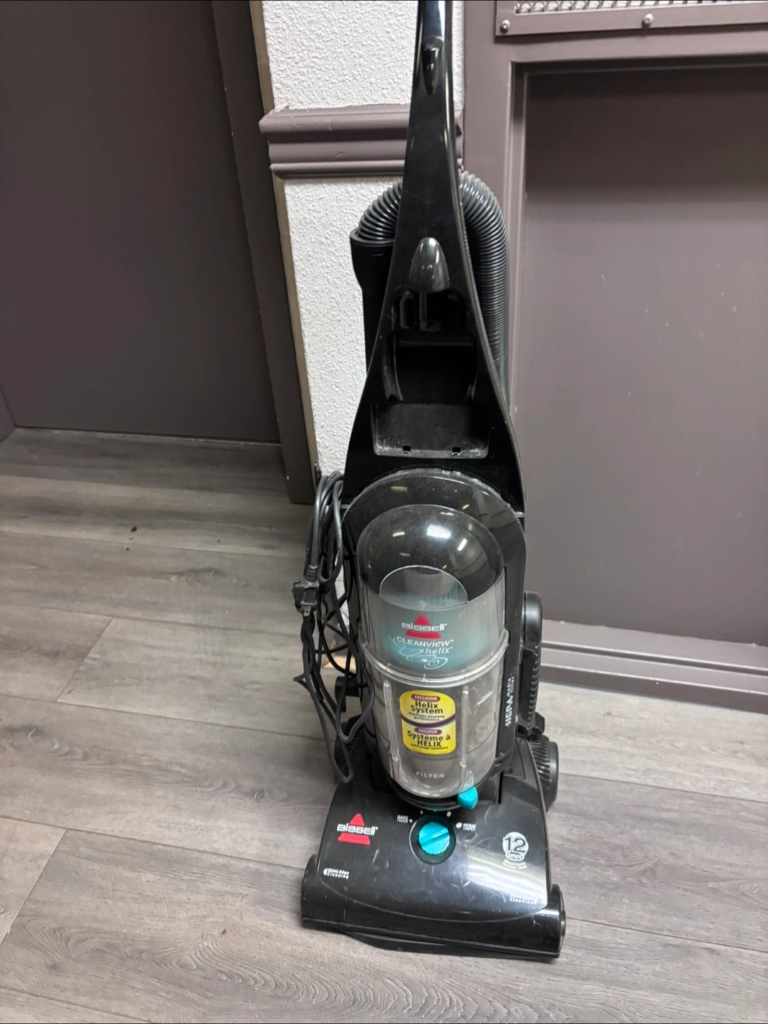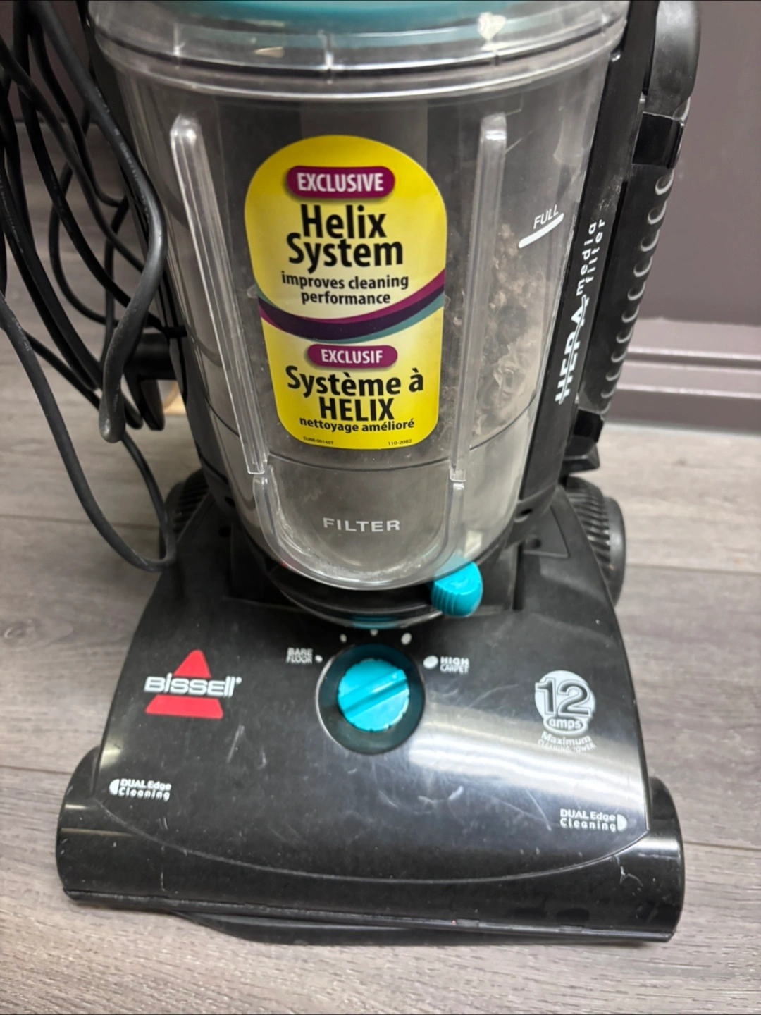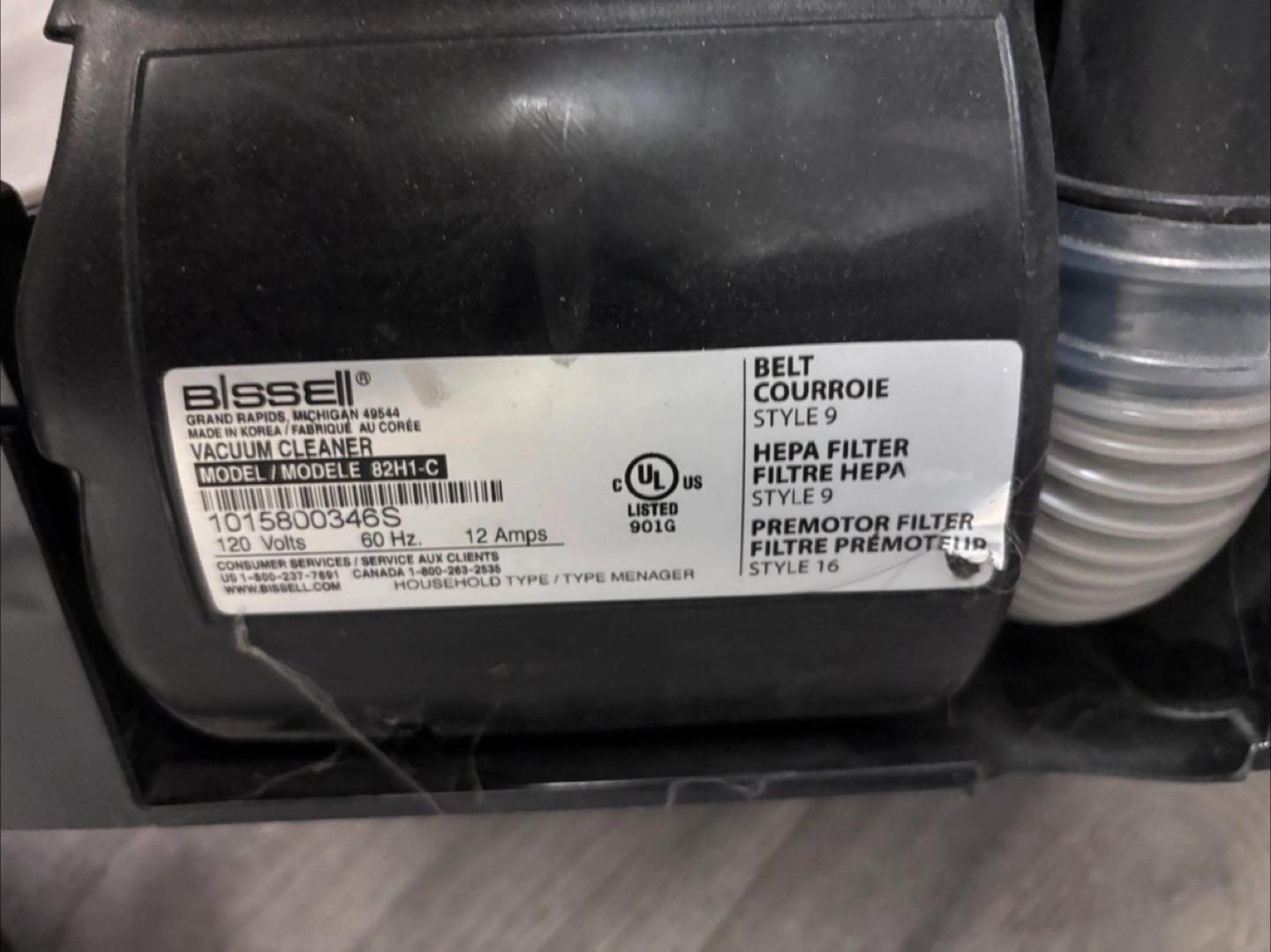 Selling a Bissell vacuum cleaner, model 82H1-C. It features the exclusive Helix System, which improves cleaning performance. It also has a HEPA filter and dual edge cleaning. The belt style is 9 and the premotor filter style is 16
