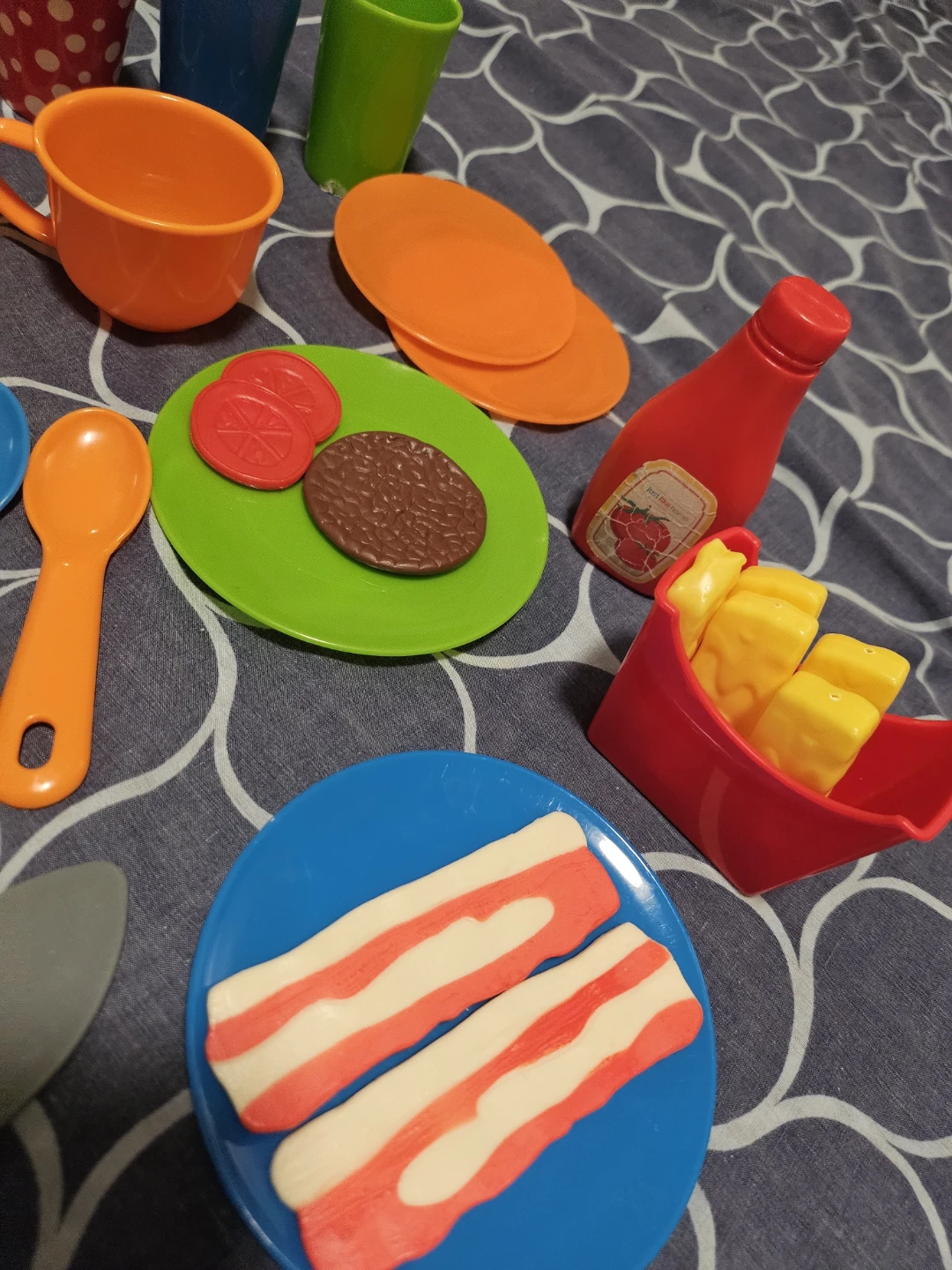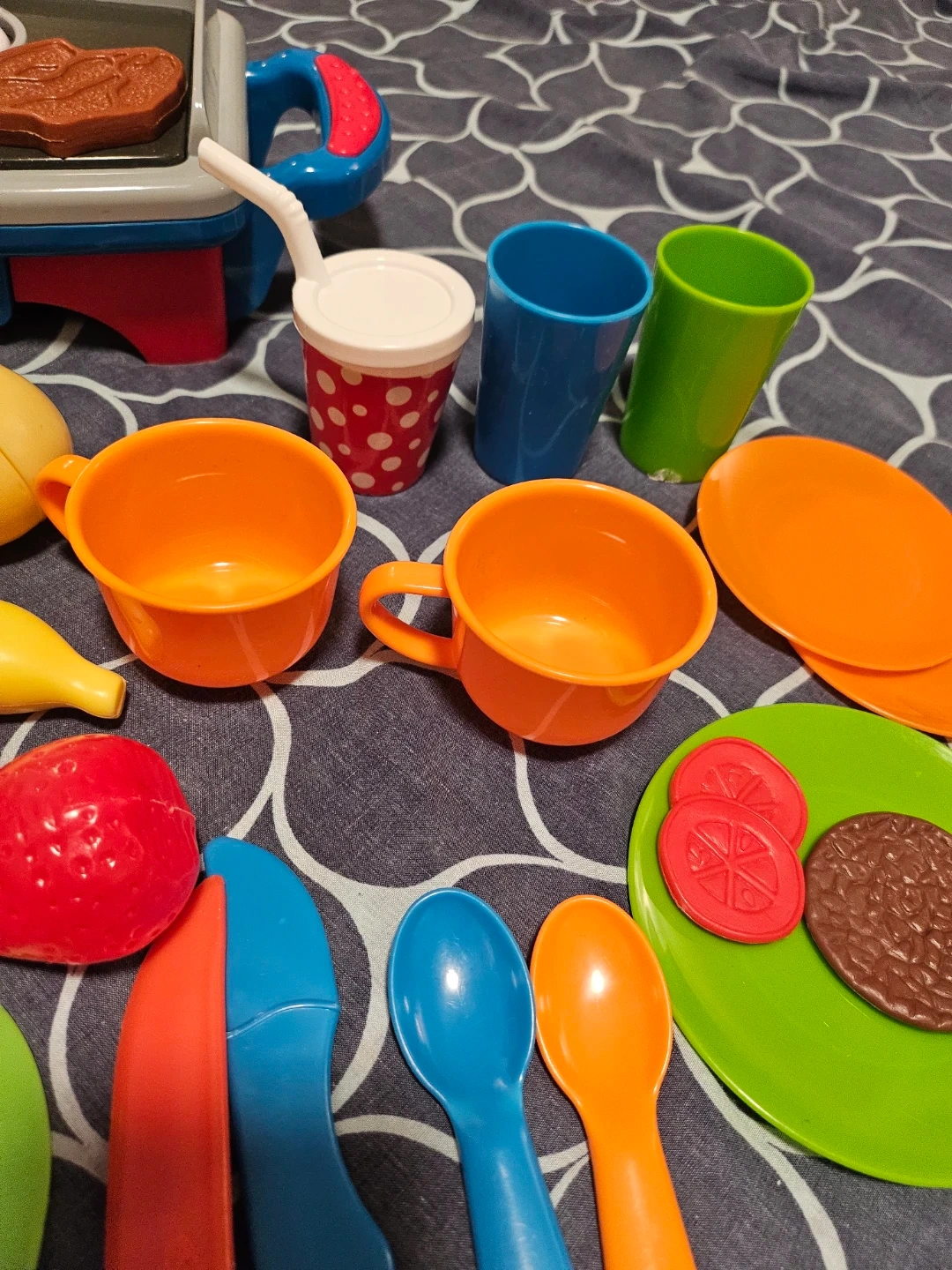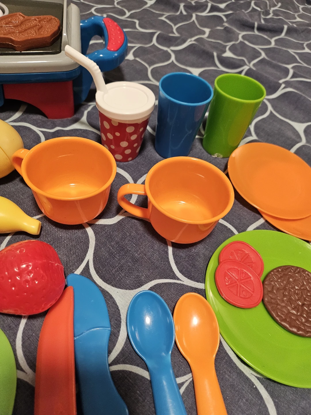 A fun and colourful play food set for your little one! This set includes a grill, various fruits and vegetables, plates, cups, and utensils. Perfect for imaginative play and developing fine motor skills. All pieces are in great condition and ready for a new chef!