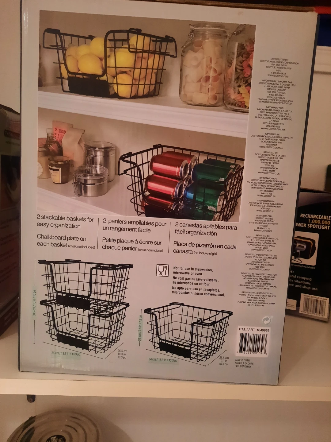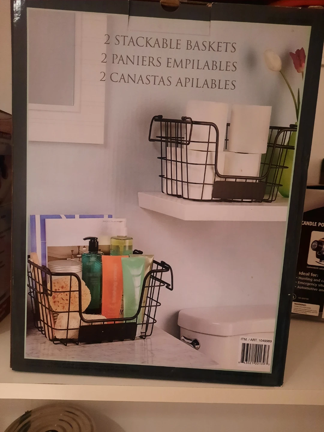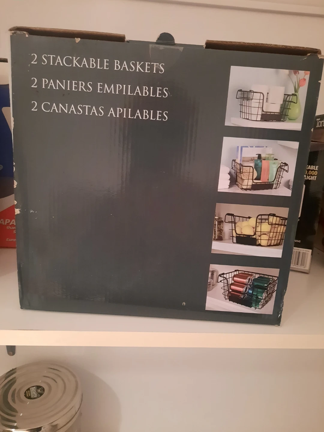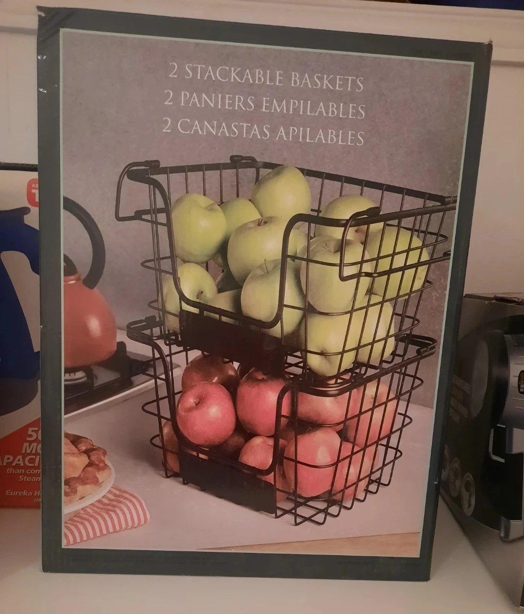 Selling a set of two stackable baskets, perfect for organizing your kitchen or pantry! They're great for storing fruits, vegetables, canned goods, or other household items.Each basket has a chalkboard plate (chalk not included) so you can label the contents.