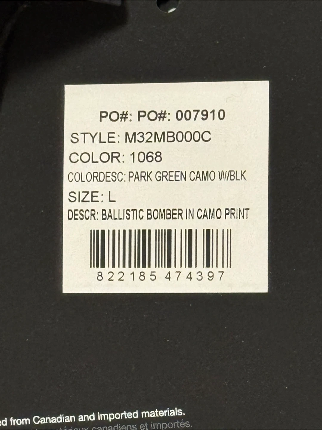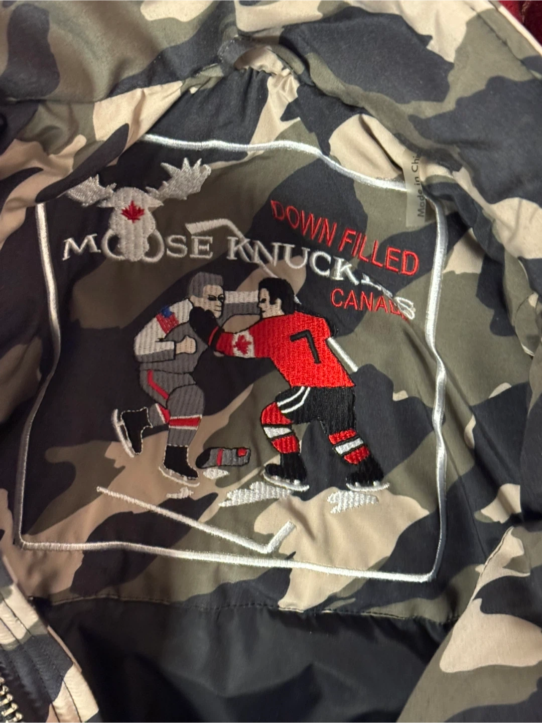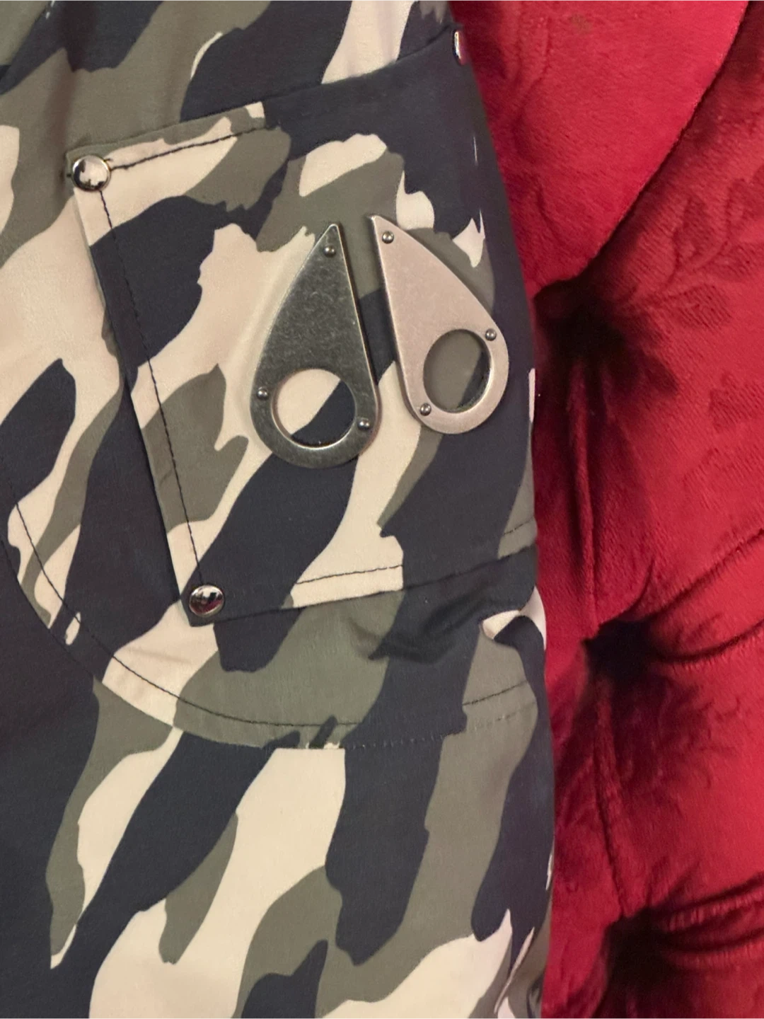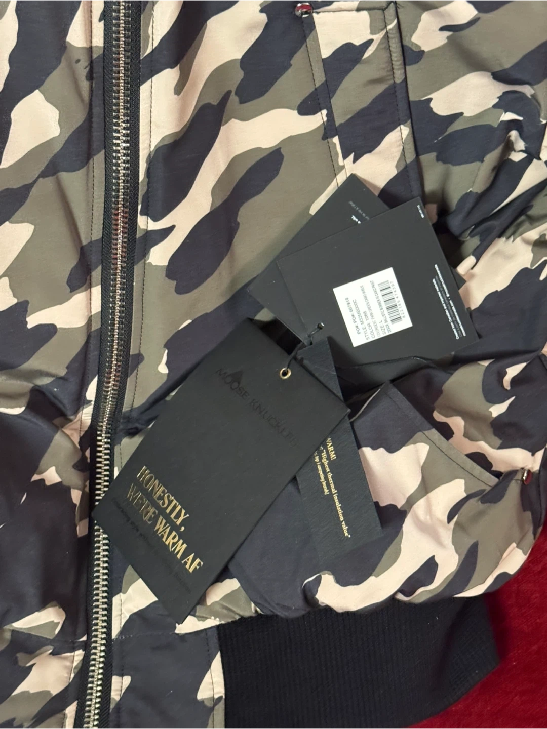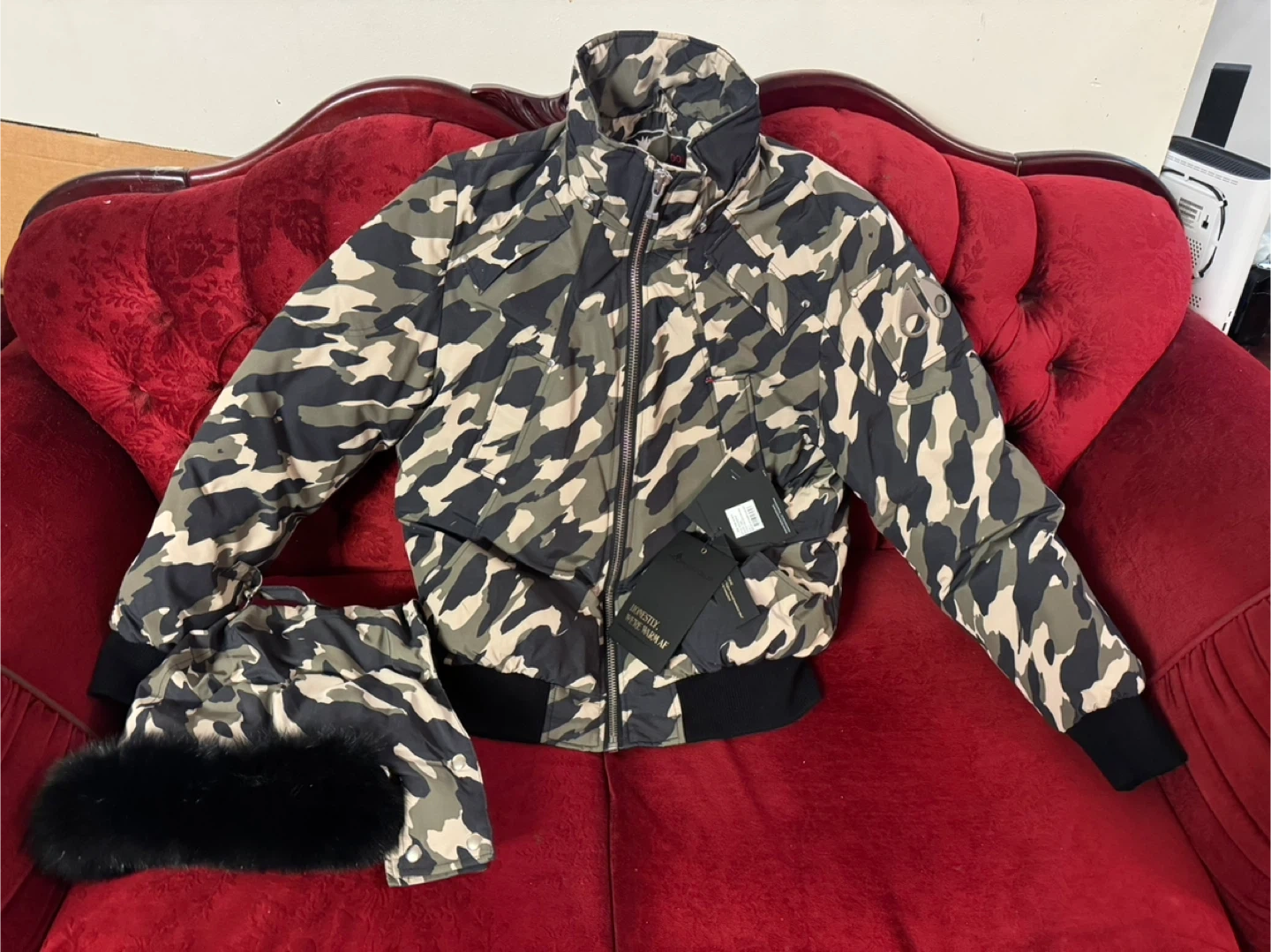 Selling a Moose Knuckles Ballistic Bomber in a cool camo print! It's a size L and the colour is described as Park Green Camo with Black. It's a stylish and warm jacket for the colder months