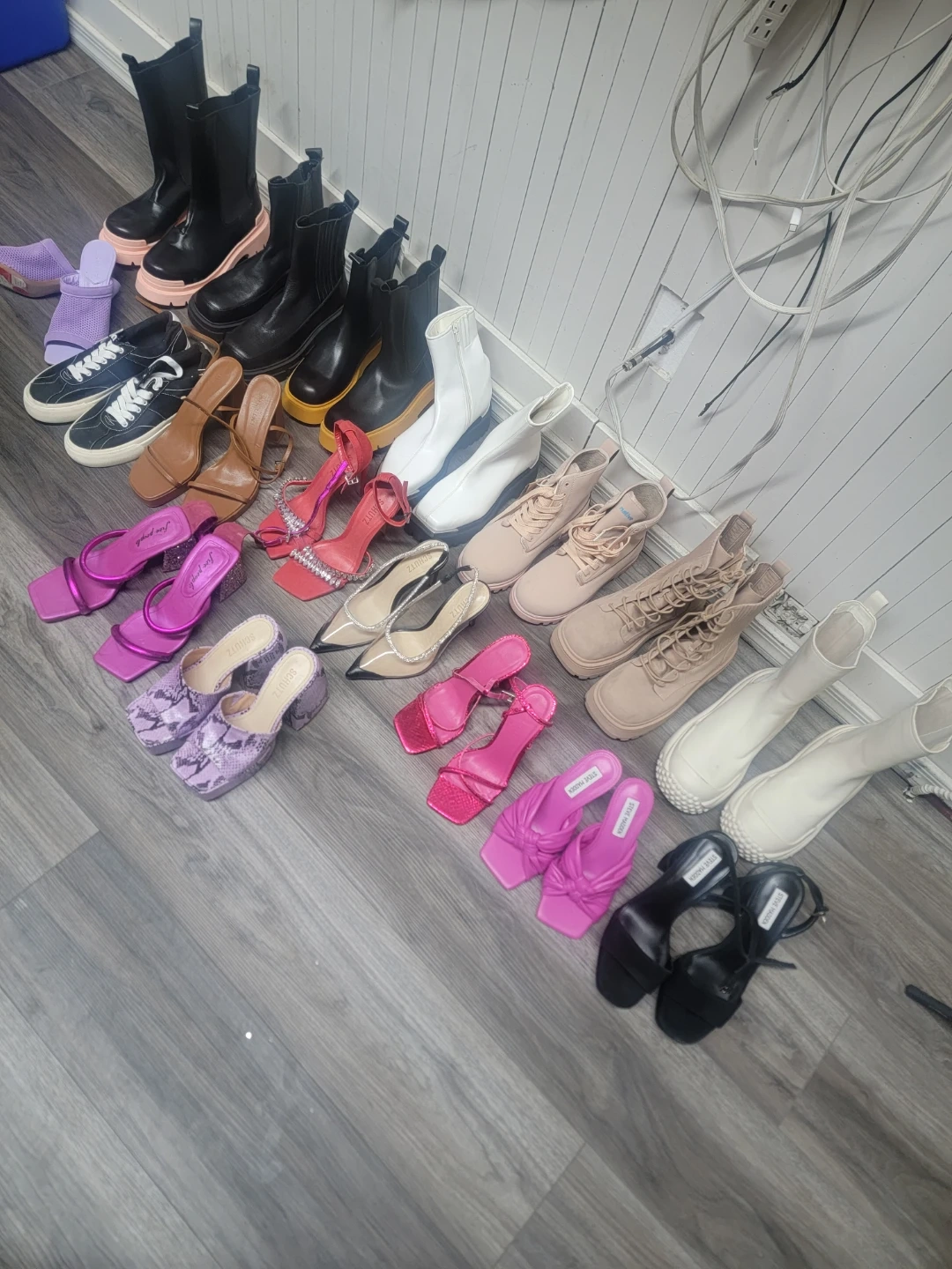 A collection of women's shoes in various styles and sizes! There are boots, heels, and sandals in different colours like black, white, pink, and purple. Brands visible include Steve Madden and Schutz. Perfect for adding variety to your wardrobe!