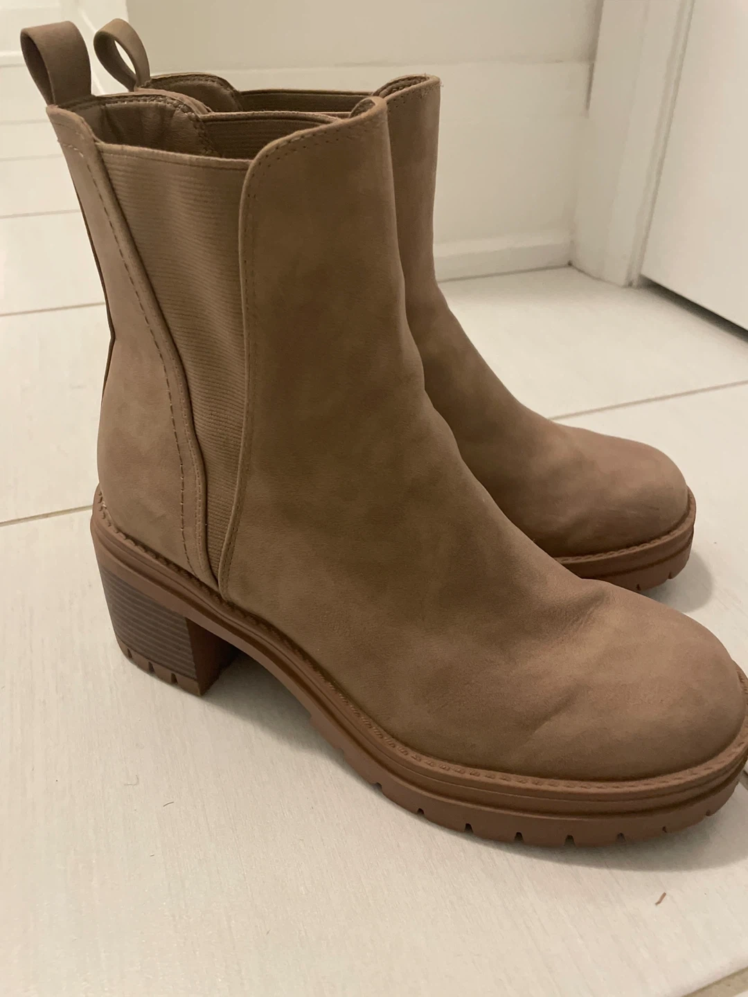 Selling a pair of boots. Two pair are black with a and the other is beige with a block heel.