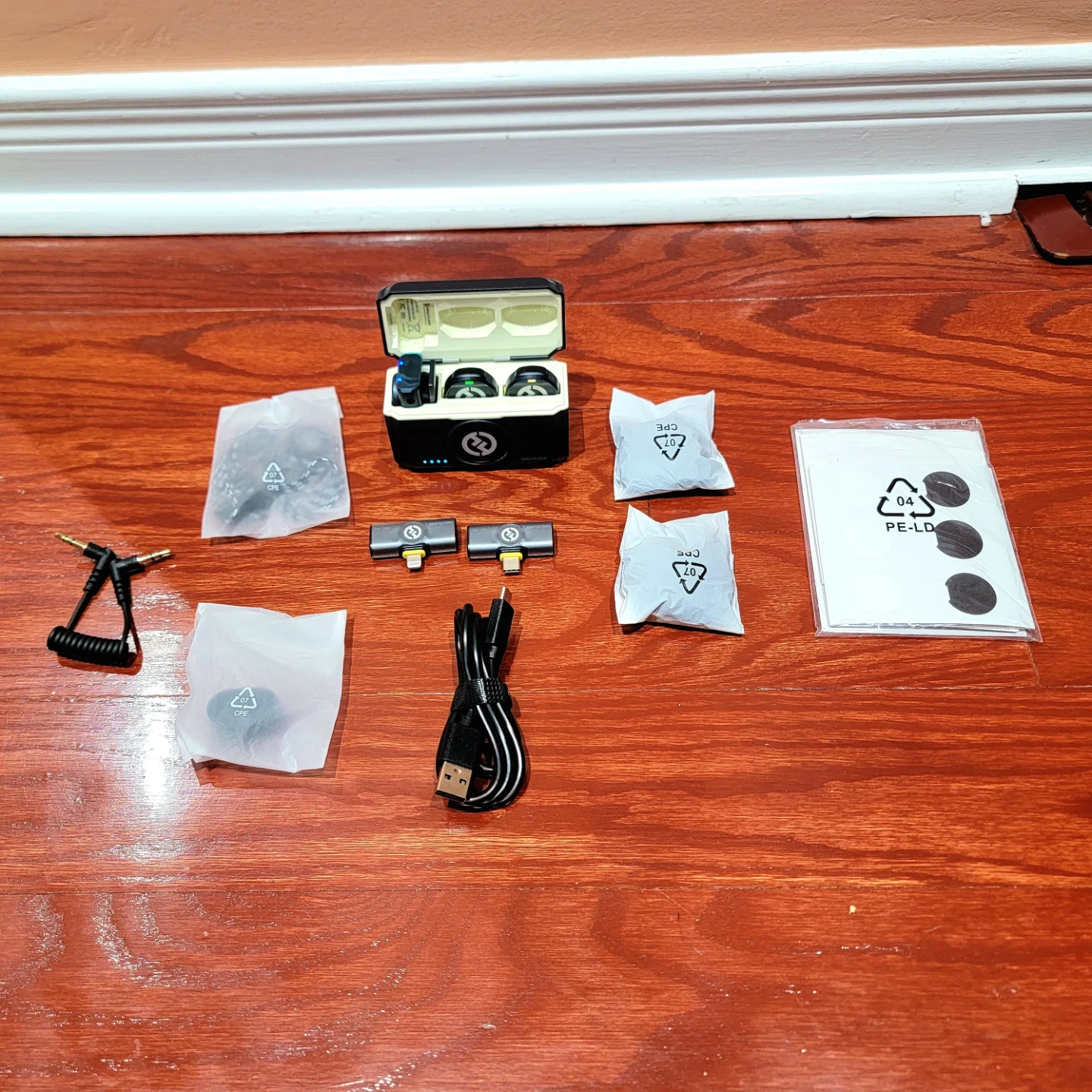 Camera RX x1, USB-C RX x1, Lightning RX x1, Clip Magnet x4, Necklace Silicone case x2, TX Windscreen x2, TX Sticker x1, Transmitter x2, Charging Case x1, USB-A to USB-C Cable x1, 3.5mm TRS to 3.5mm TRS Cable (Camera) x1.