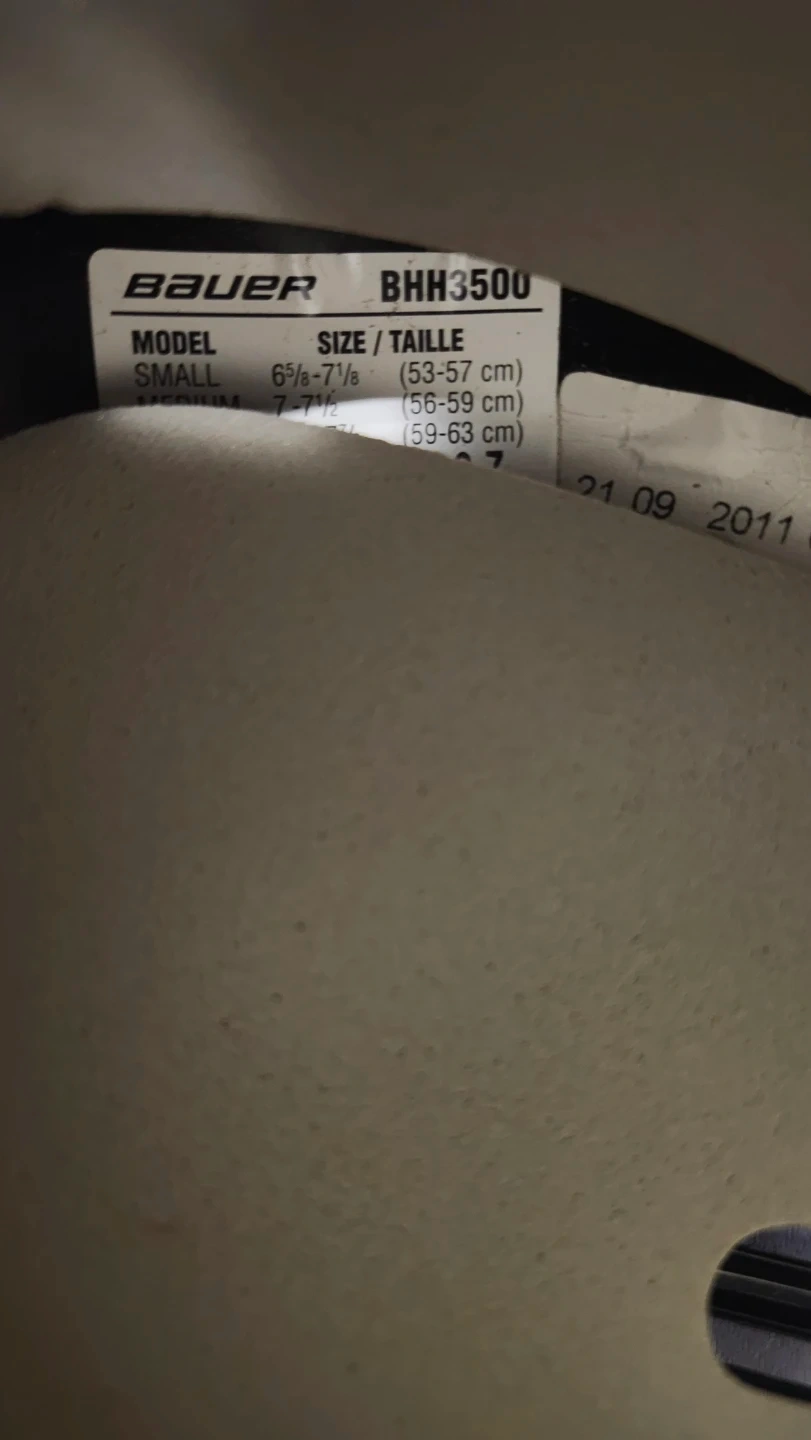 Selling a Bauer hockey helmet, model BHH3500. It's a size medium (6 5/8 - 7 1/4 inches, or 53-59 cm). Great for hitting the ice!