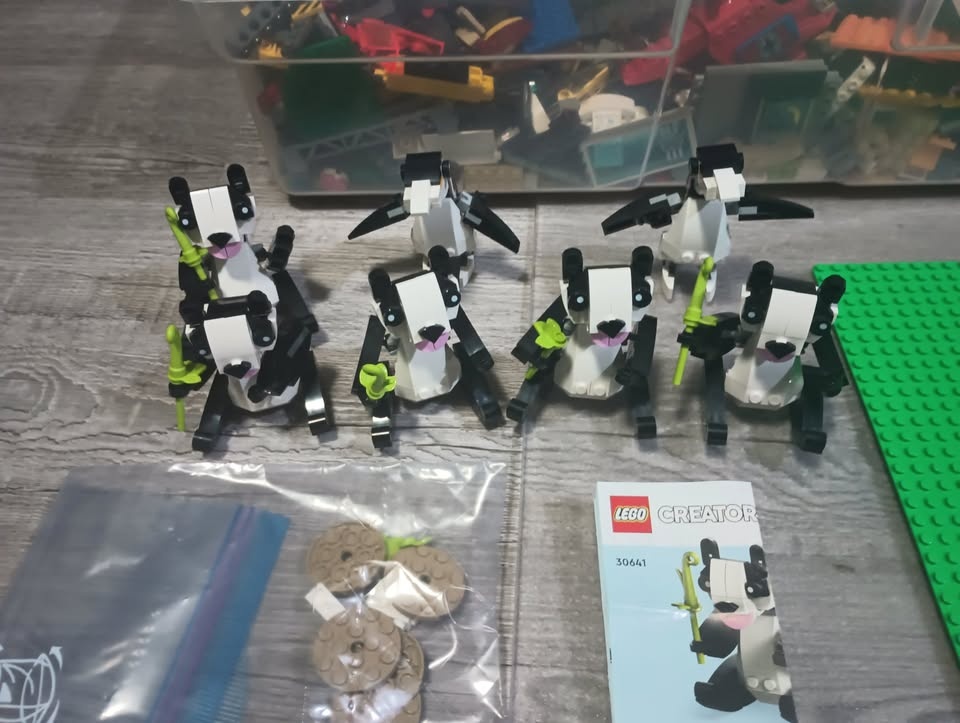 Lot of 8 pounds of Lego blocks, parts and pieces including various green baseplates, several Lego Panda/Penguin/Whale 3-in-1 sets (mostly complete, just missing some greenery plant pieces) and a 26.4 litre/7 gallon Rubbermaid container with lid to store it all in. From a SF/BF home in Charleswood.