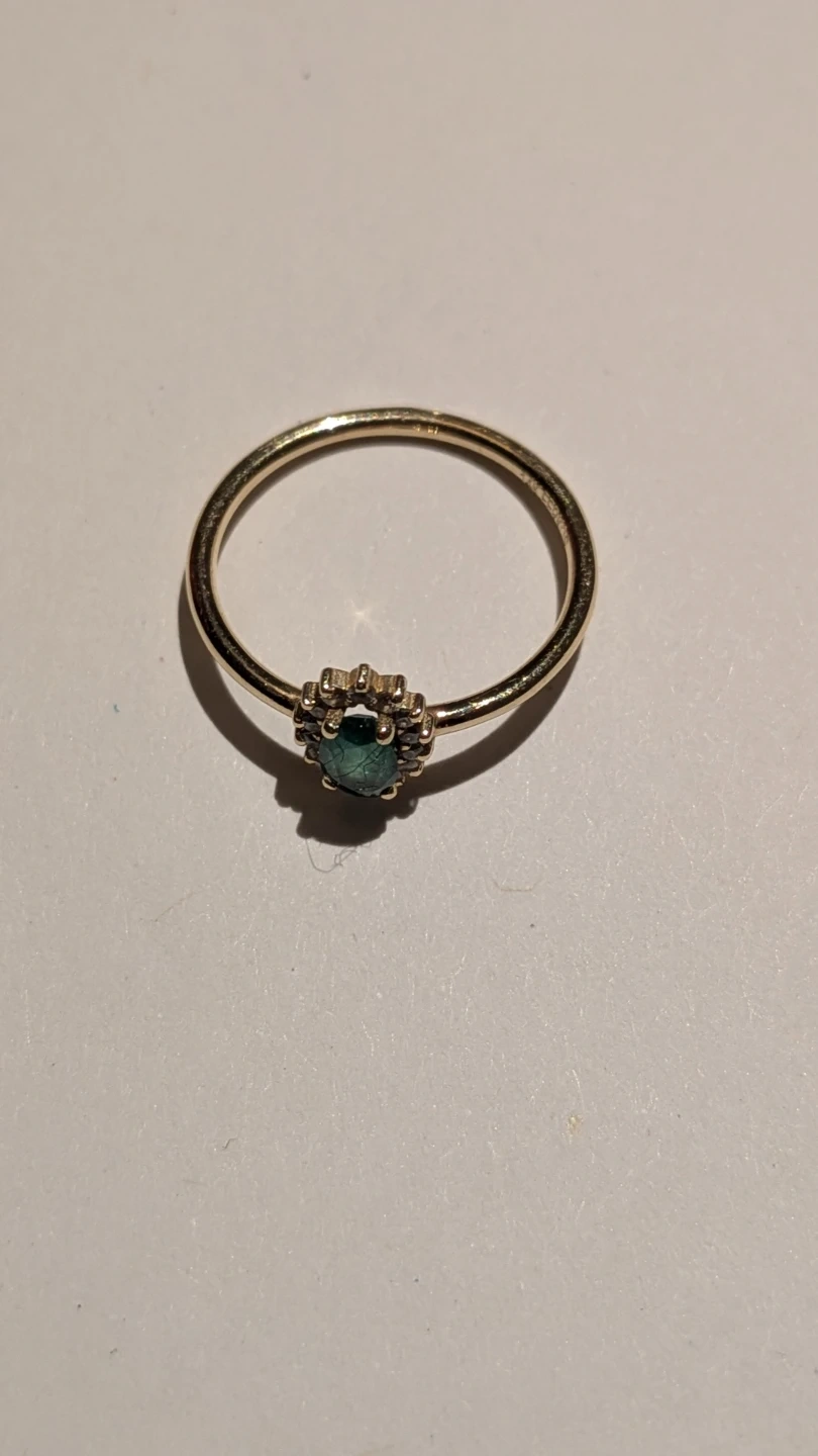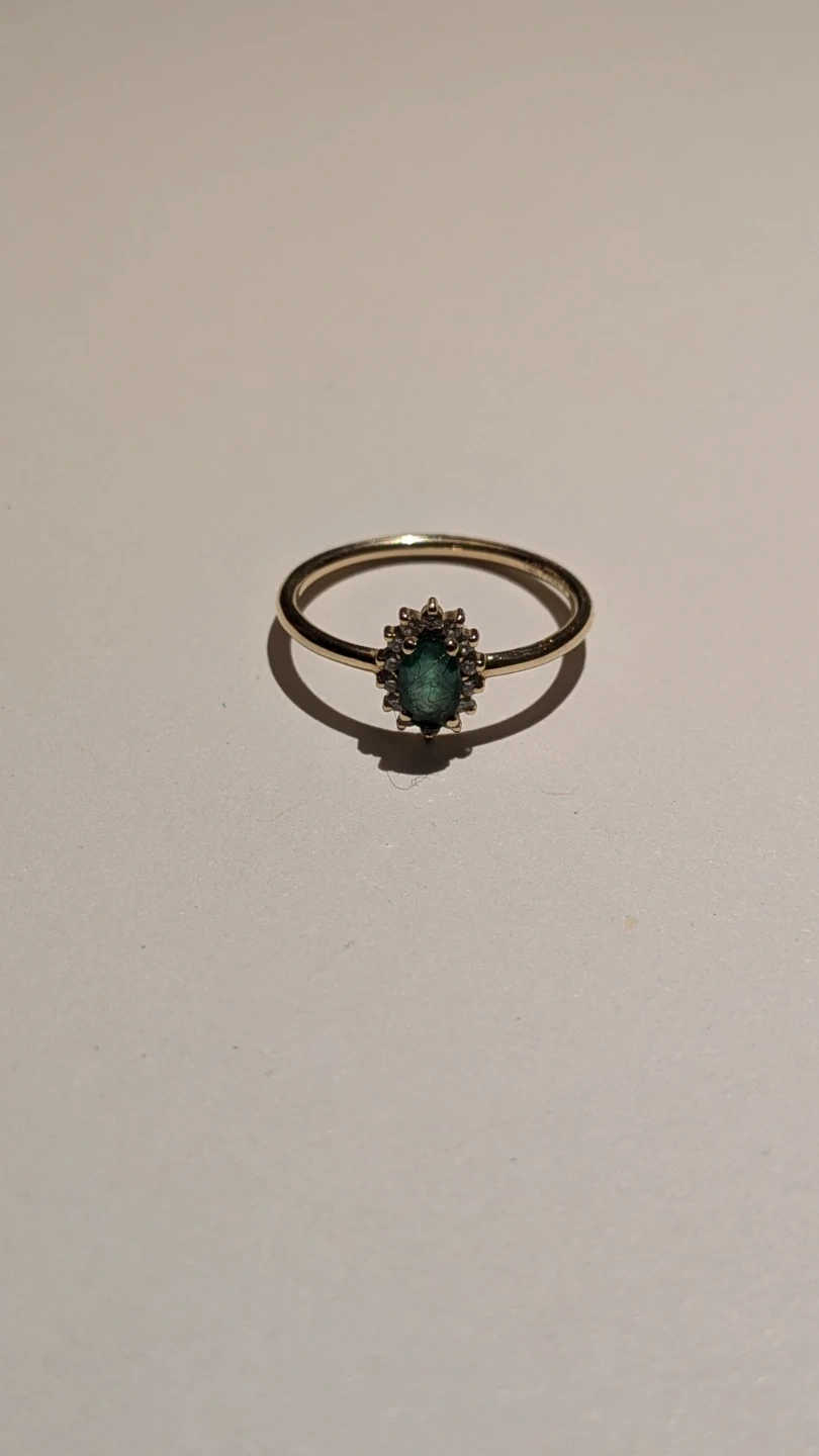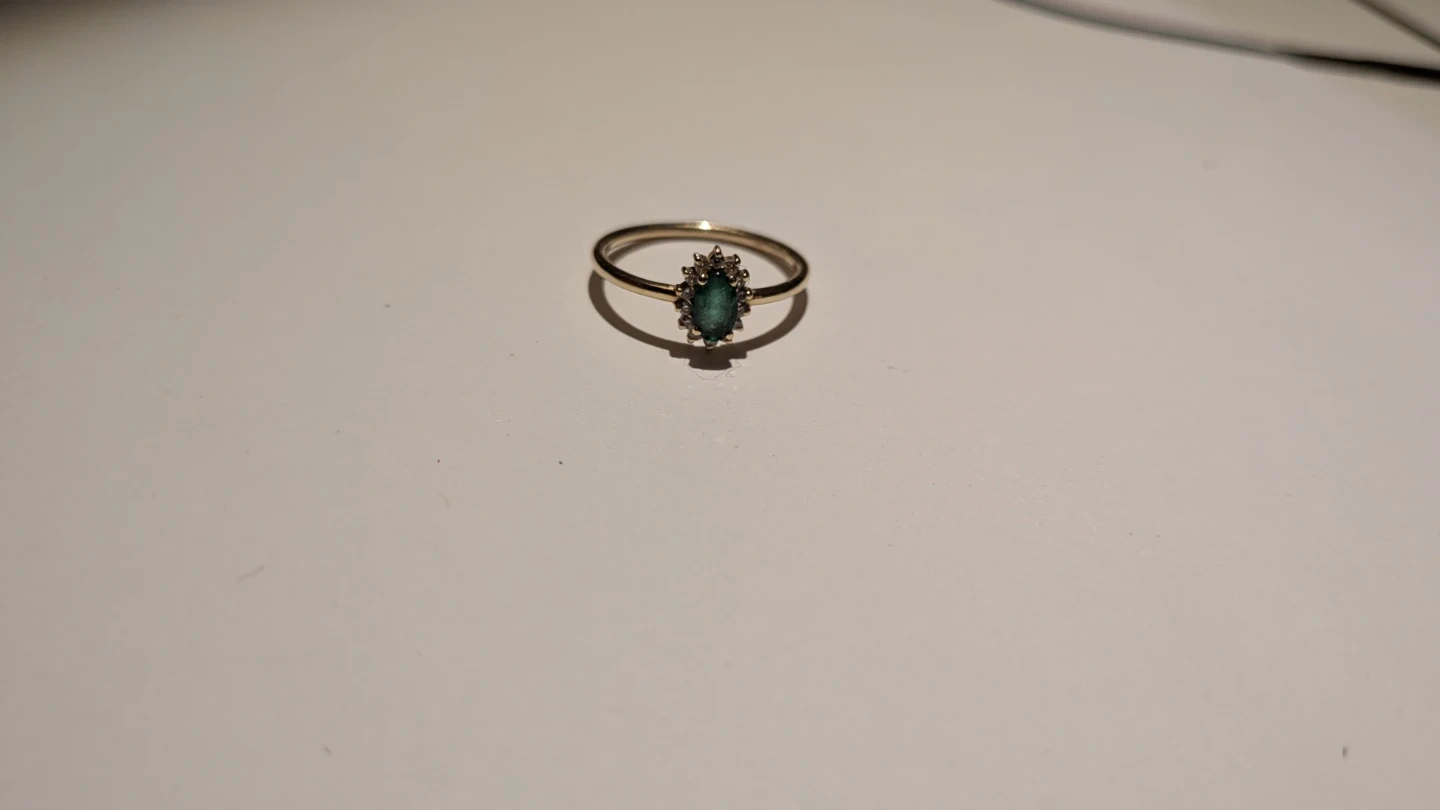 Selling a beautiful emerald and gold ring. It features a lovely green emerald surrounded by smaller diamond stones, set in a gold band. It's in great condition and ready to wear! Bought at 560 dollars.