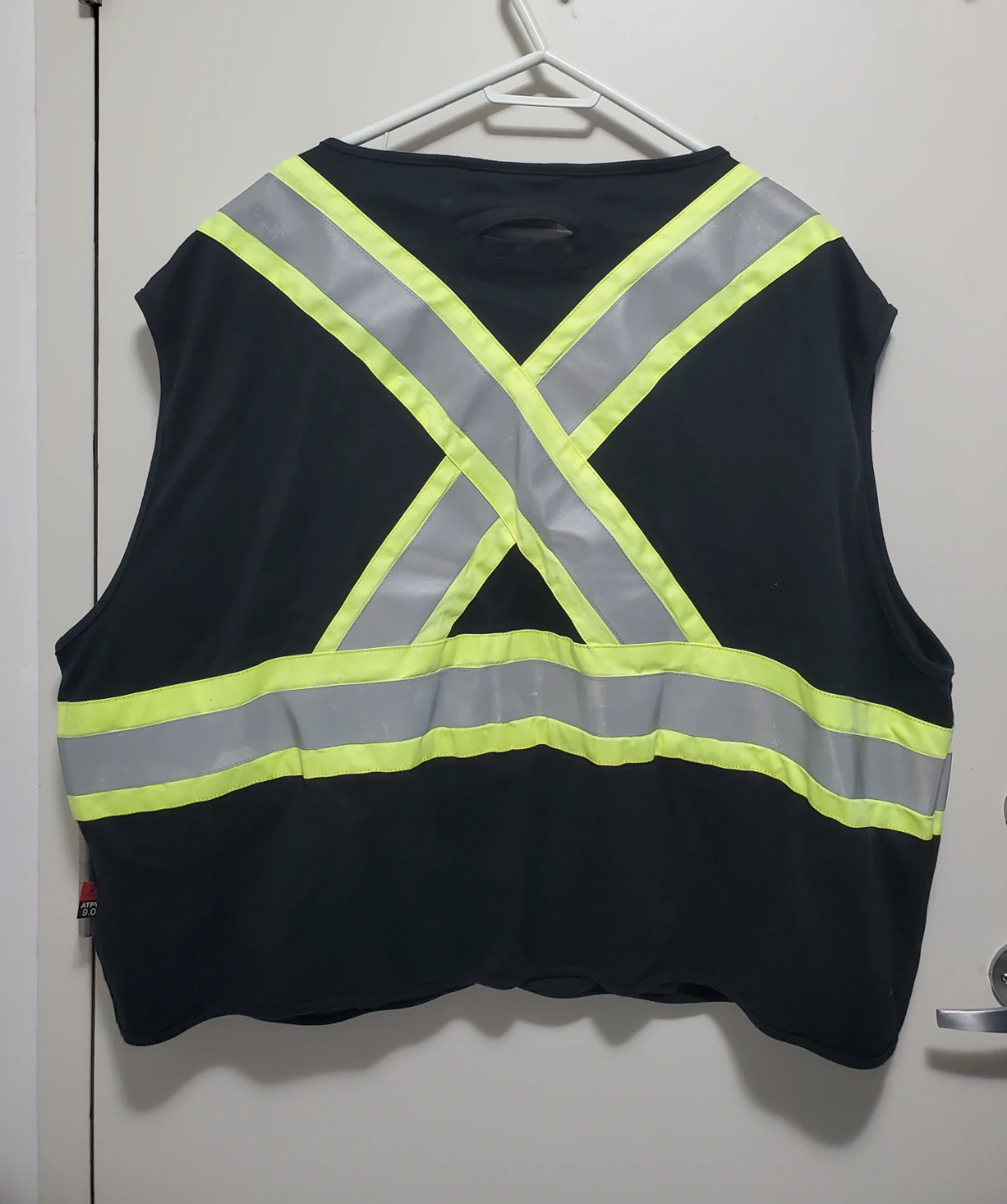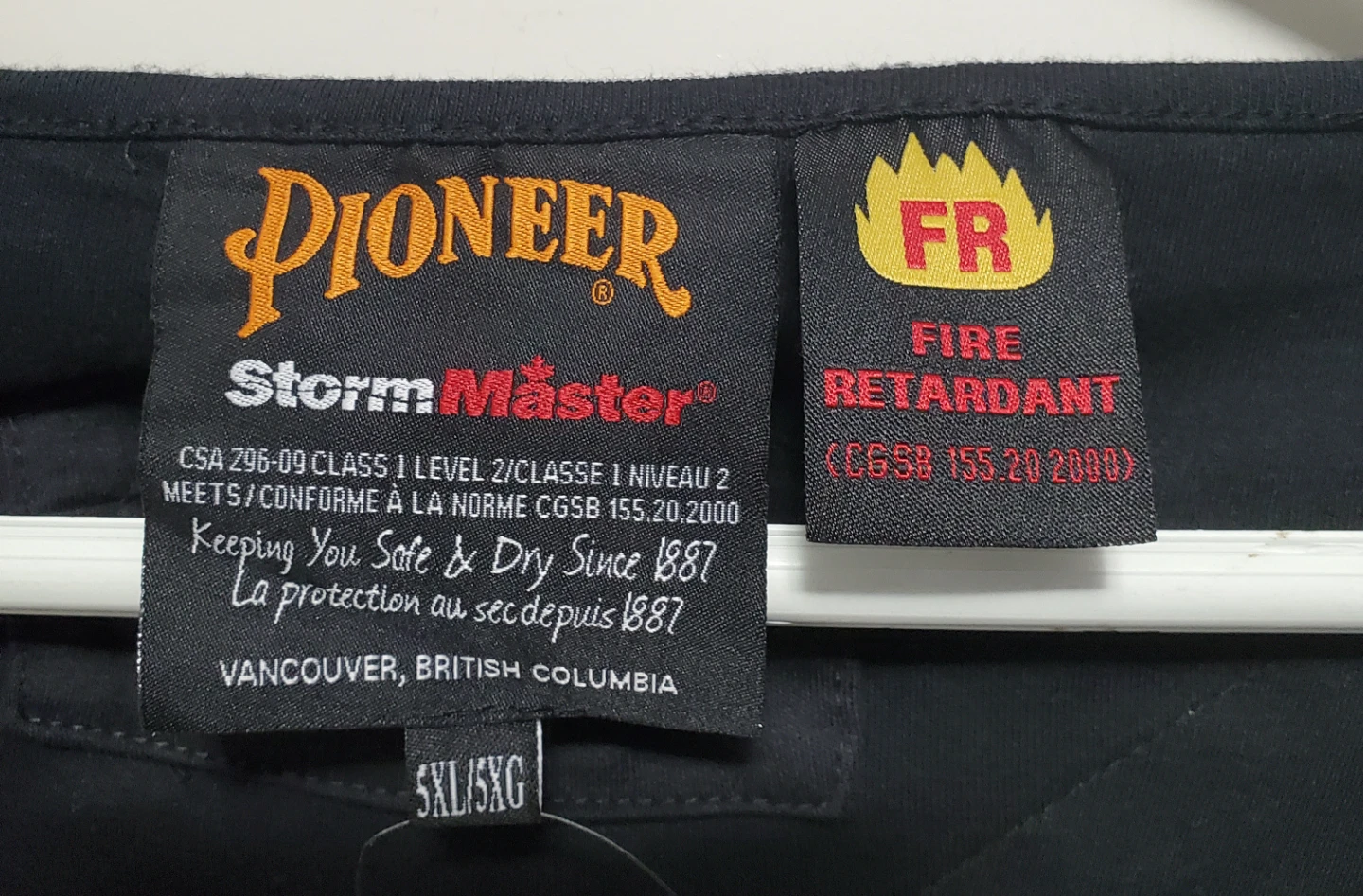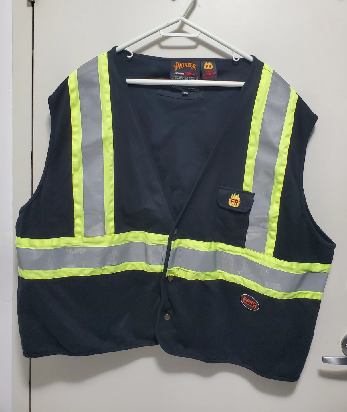 Selling a Pioneer Storm Master fire retardant safety vest in size 5XL. It's black with reflective yellow and silver stripes.