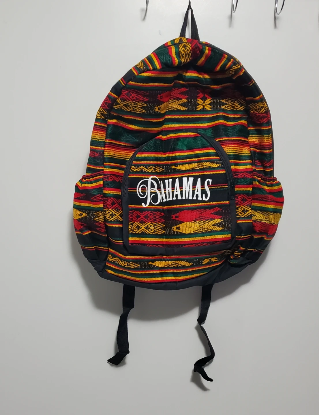 Here's a fun backpack with a colourful pattern! It says "Bahamas" on the front in white lettering.