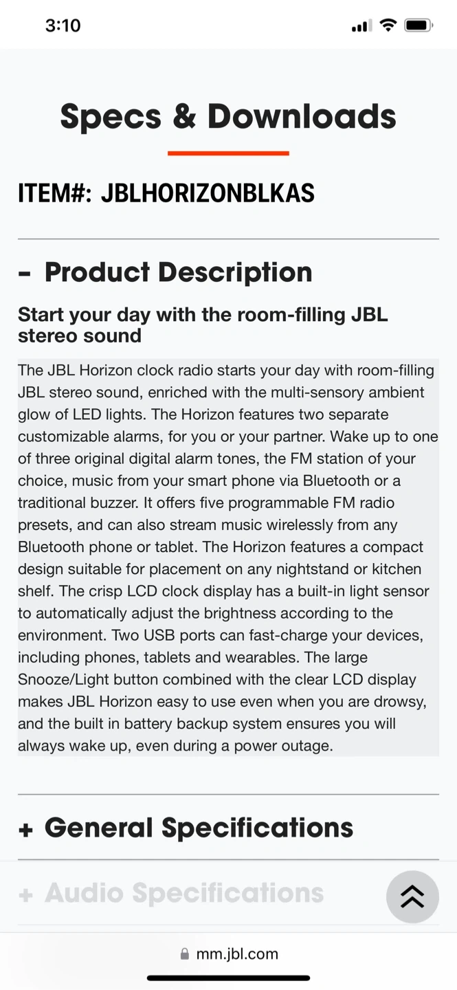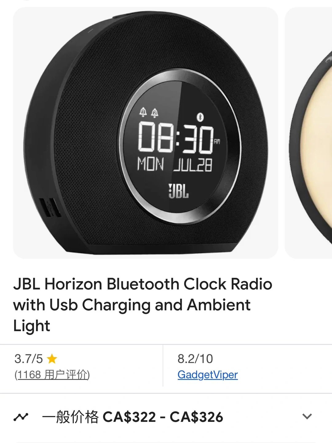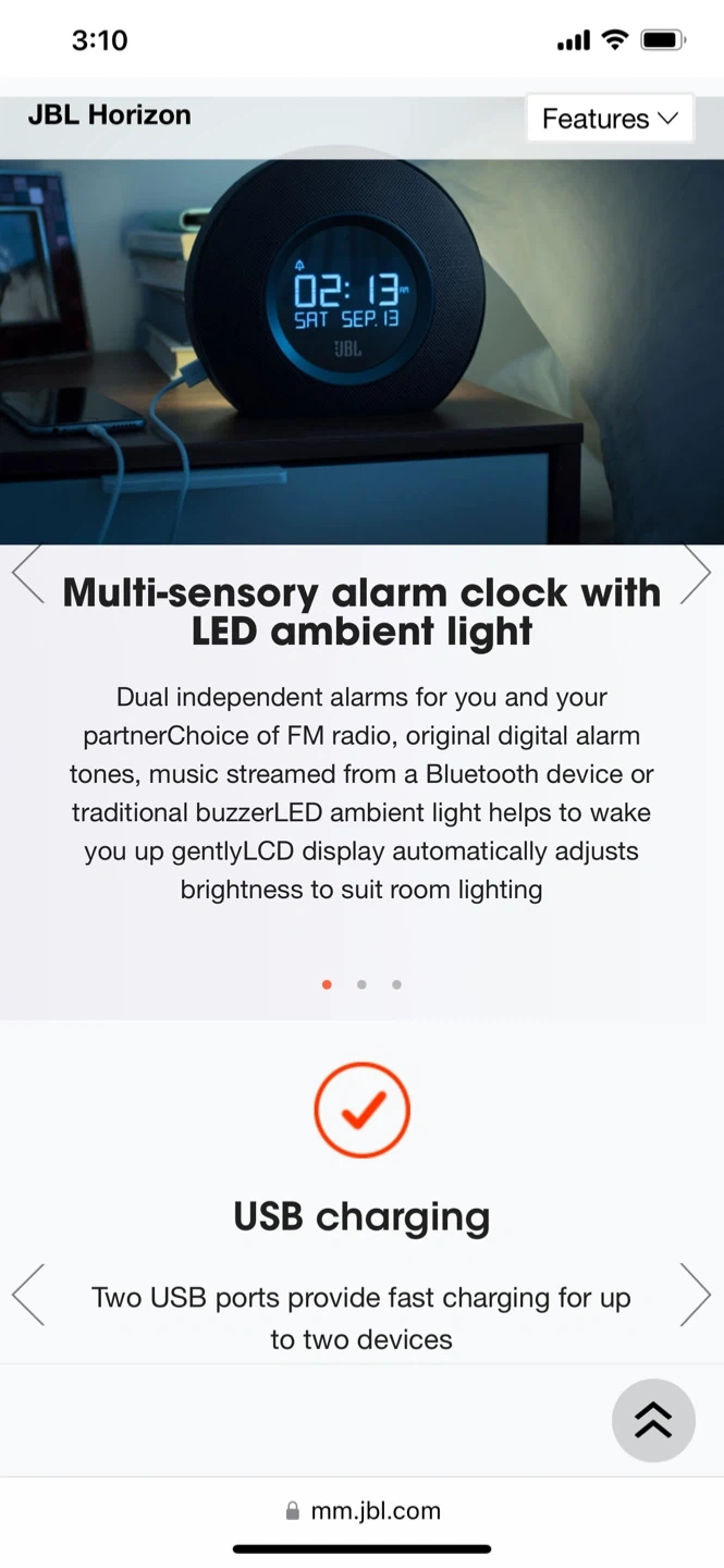Selling a JBL Horizon Bluetooth clock radio! It has USB charging and ambient light. The clock radio starts your day with room-filling JBL stereo sound, enriched with multi-sensory ambient glow of LED lights. It features two separate customizable alarms, for you or your partner. Wake up to one of three original digital alarm tones, the FM station of your choice, music from your smart phone via Bluetooth or a traditional buzzer. The Horizon features a compact design suitable for placement on any nightstand or kitchen shelf. Two USB ports provide fast charging for up to two devices. The large Snooze/Light button combined with the clear LCD display makes JBL Horizon easy to use even when you are drowsy, and the built in battery backup system ensures you will always wake up, even during a power outage