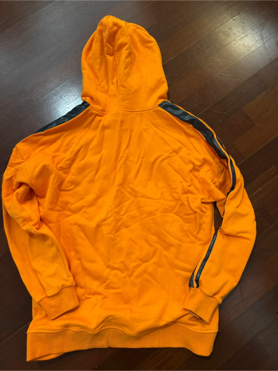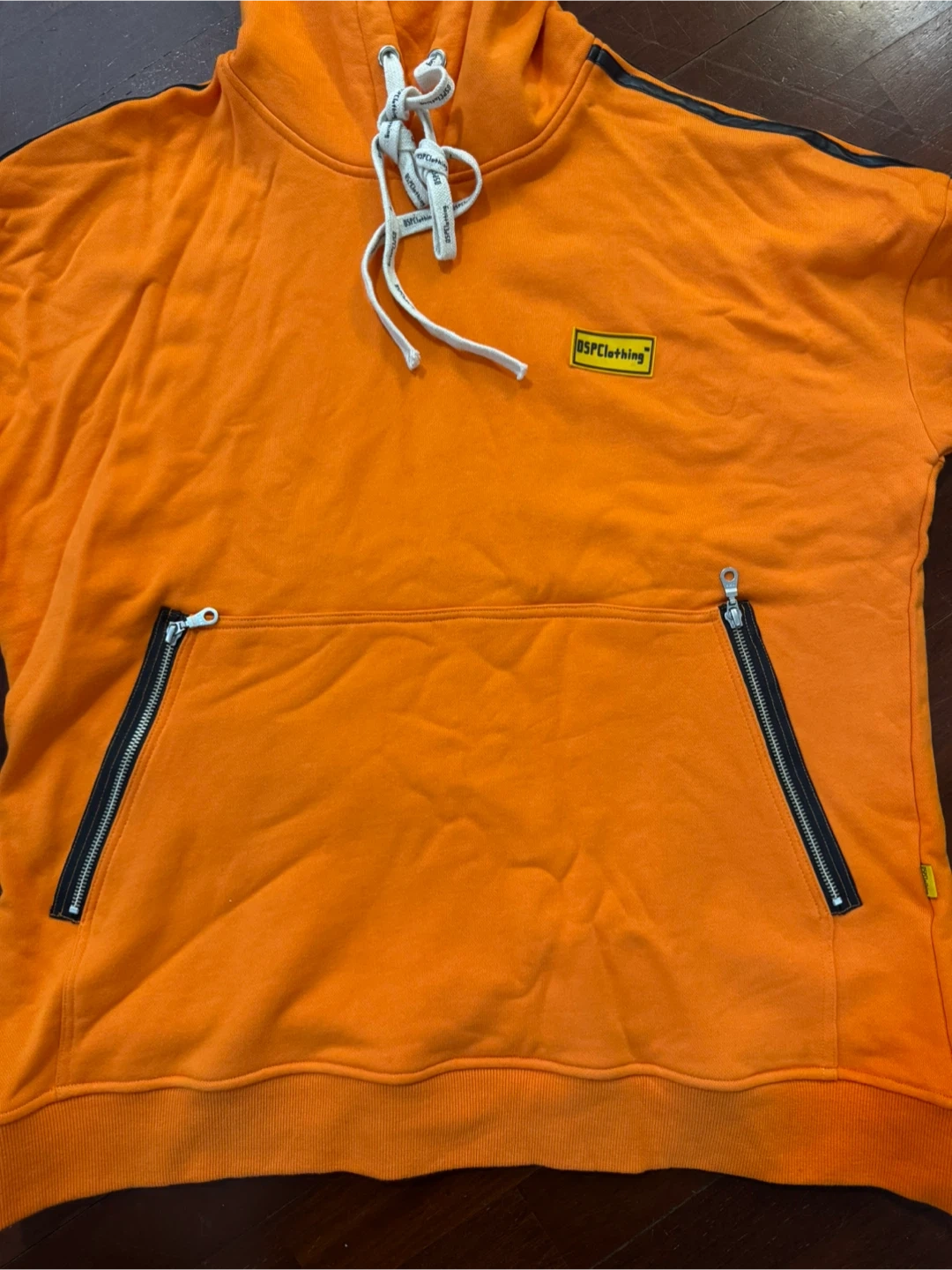 Selling a DSPClothing hoodie in size large! It's a vibrant orange colour with black stripes on the sleeves and a unique zippered pocket design. The hoodie is in great condition and ready for a new owner