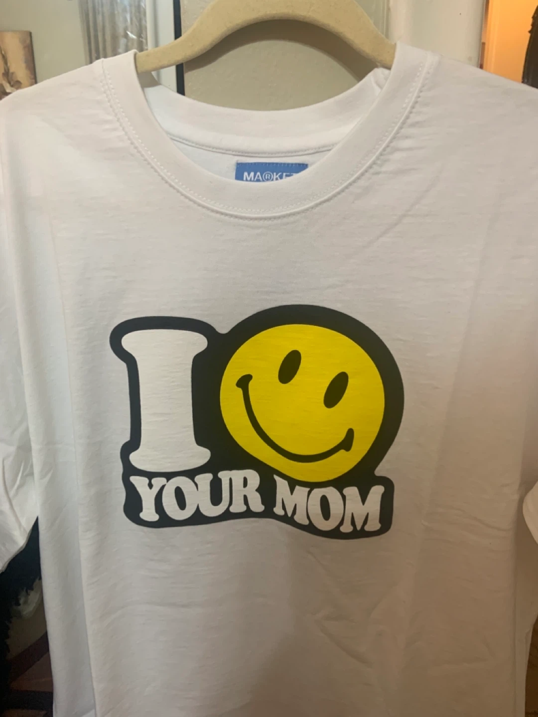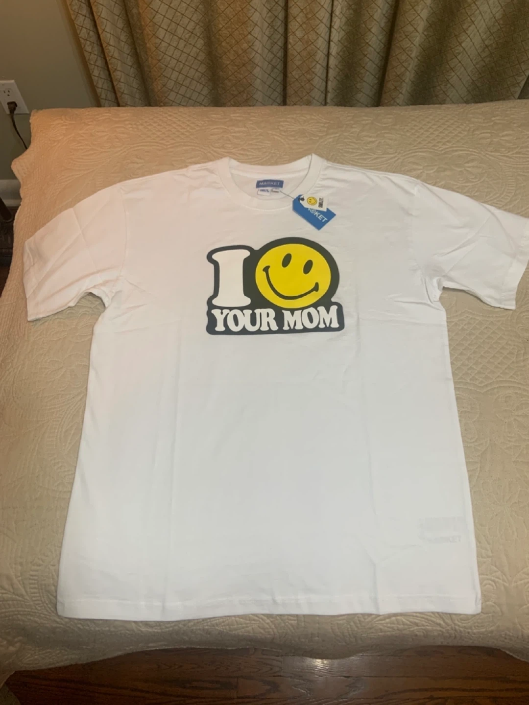 I'm selling a brand new MARKET x Smiley T-shirt! It's white and a size large. The design features the classic Smiley face with the words 'I ❤️ Your Mom'. It's still got the tags on it!