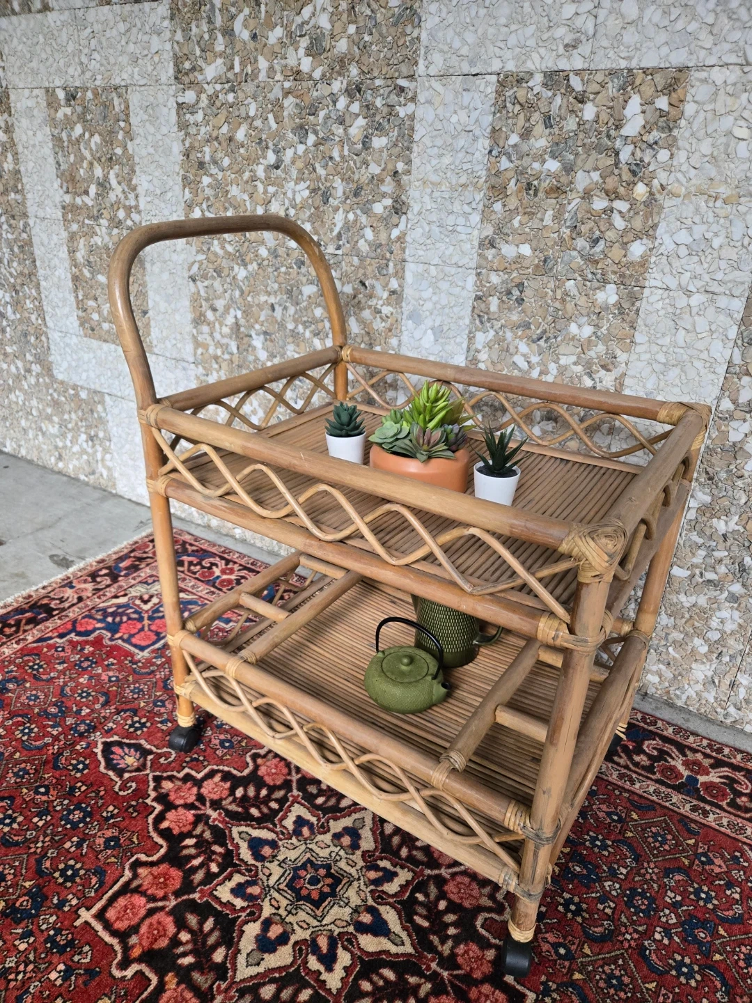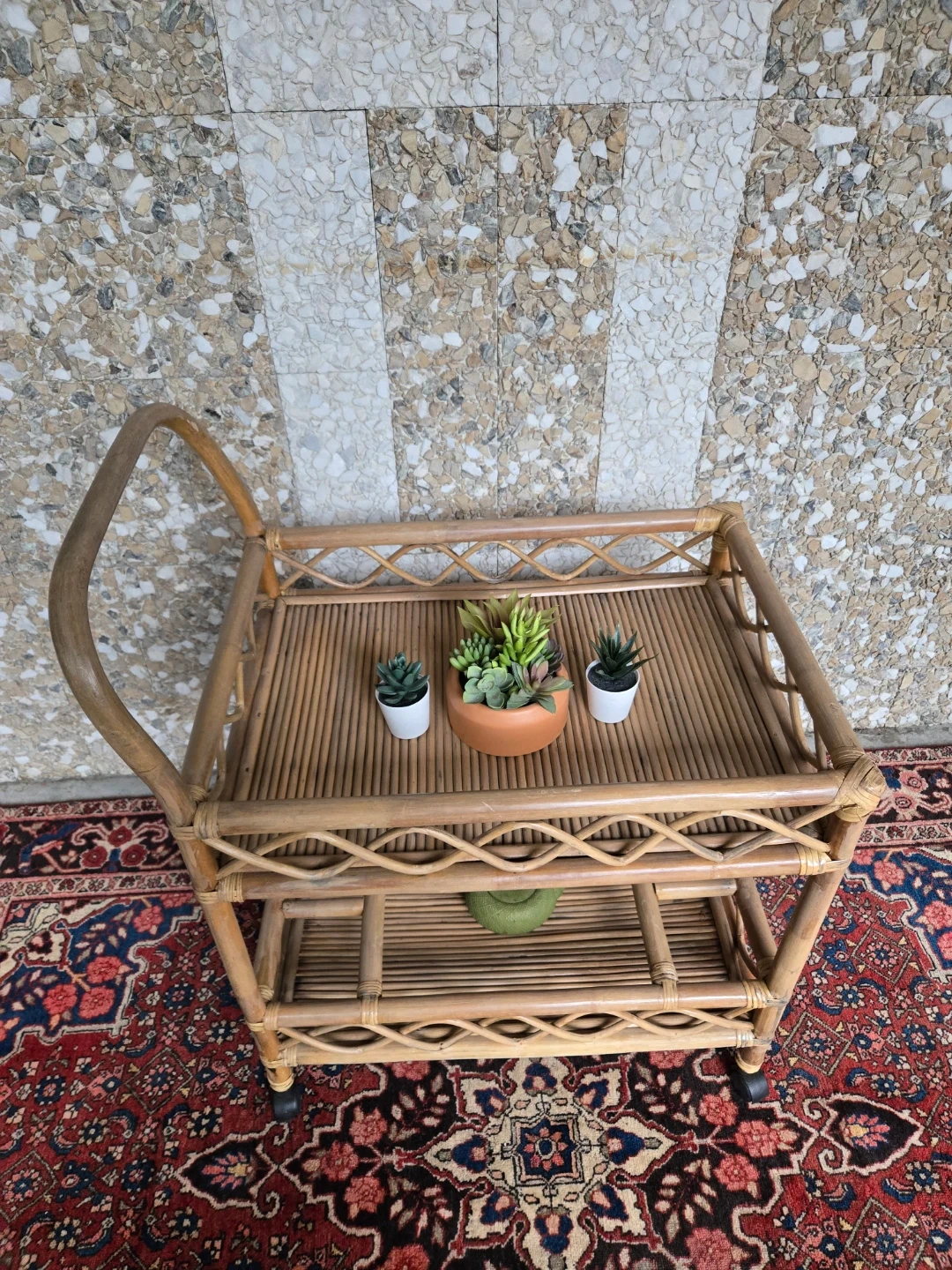 Vintage Bohemian Bamboo Two Tier Bar/Tea Cart On Wheels