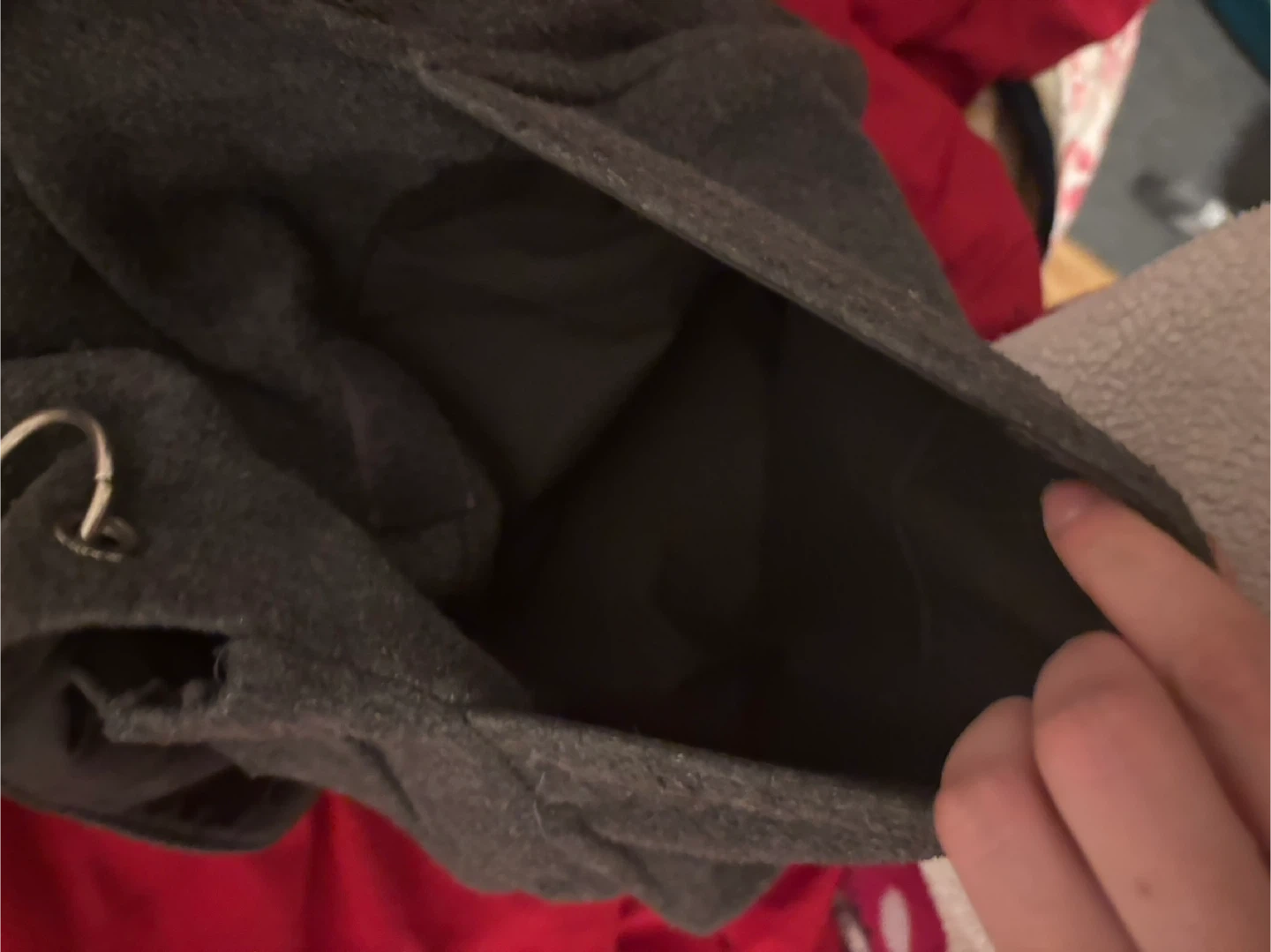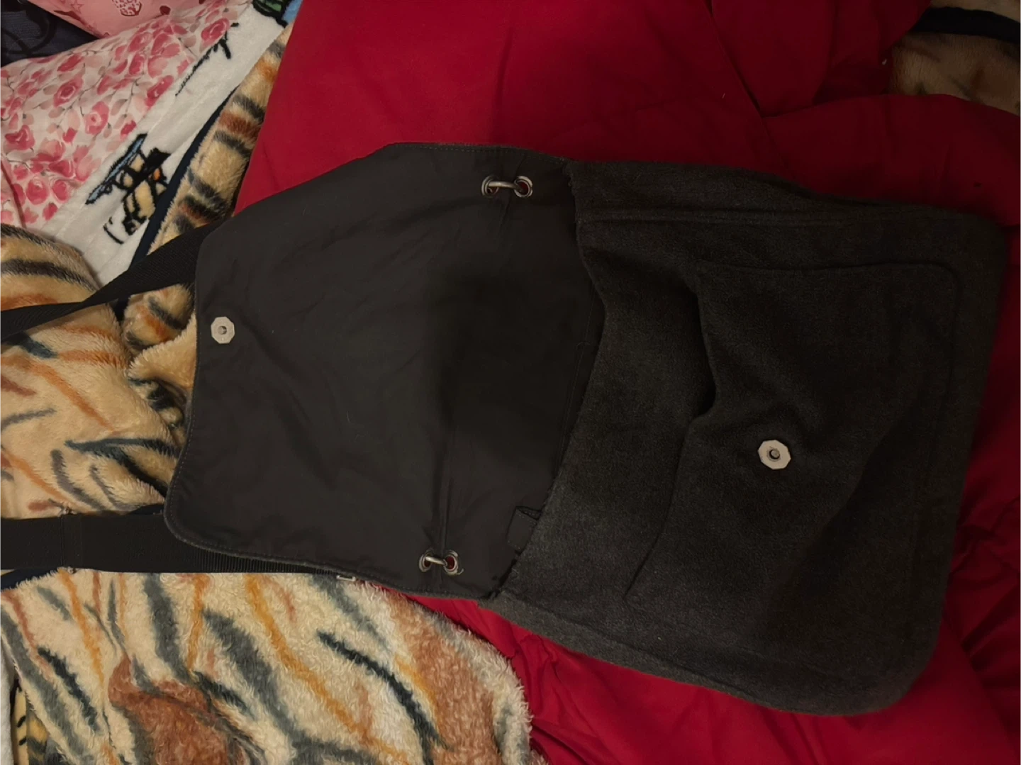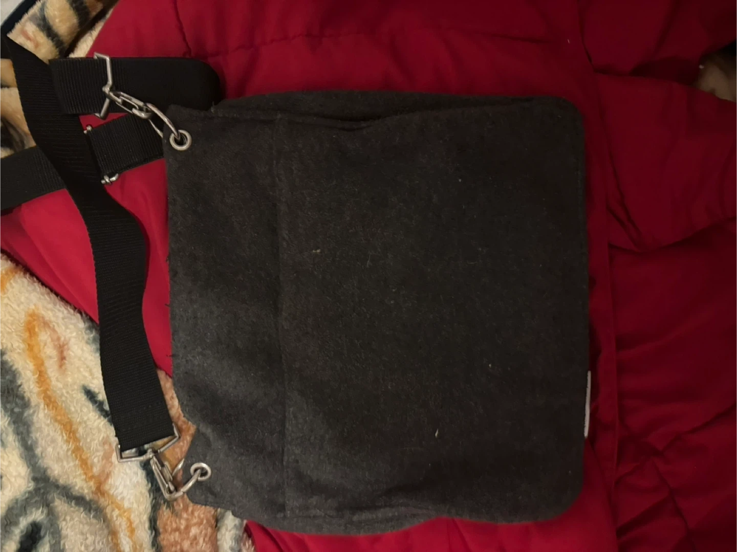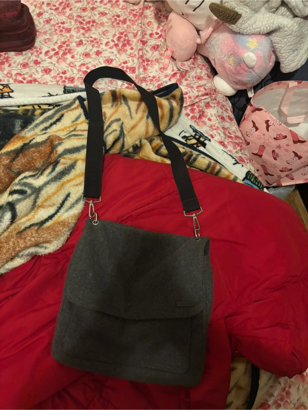 Selling a gray shoulder bag. It has a black strap and silver hardware. The bag has a flap closure with a snap. It's in good condition and ready for a new owner!