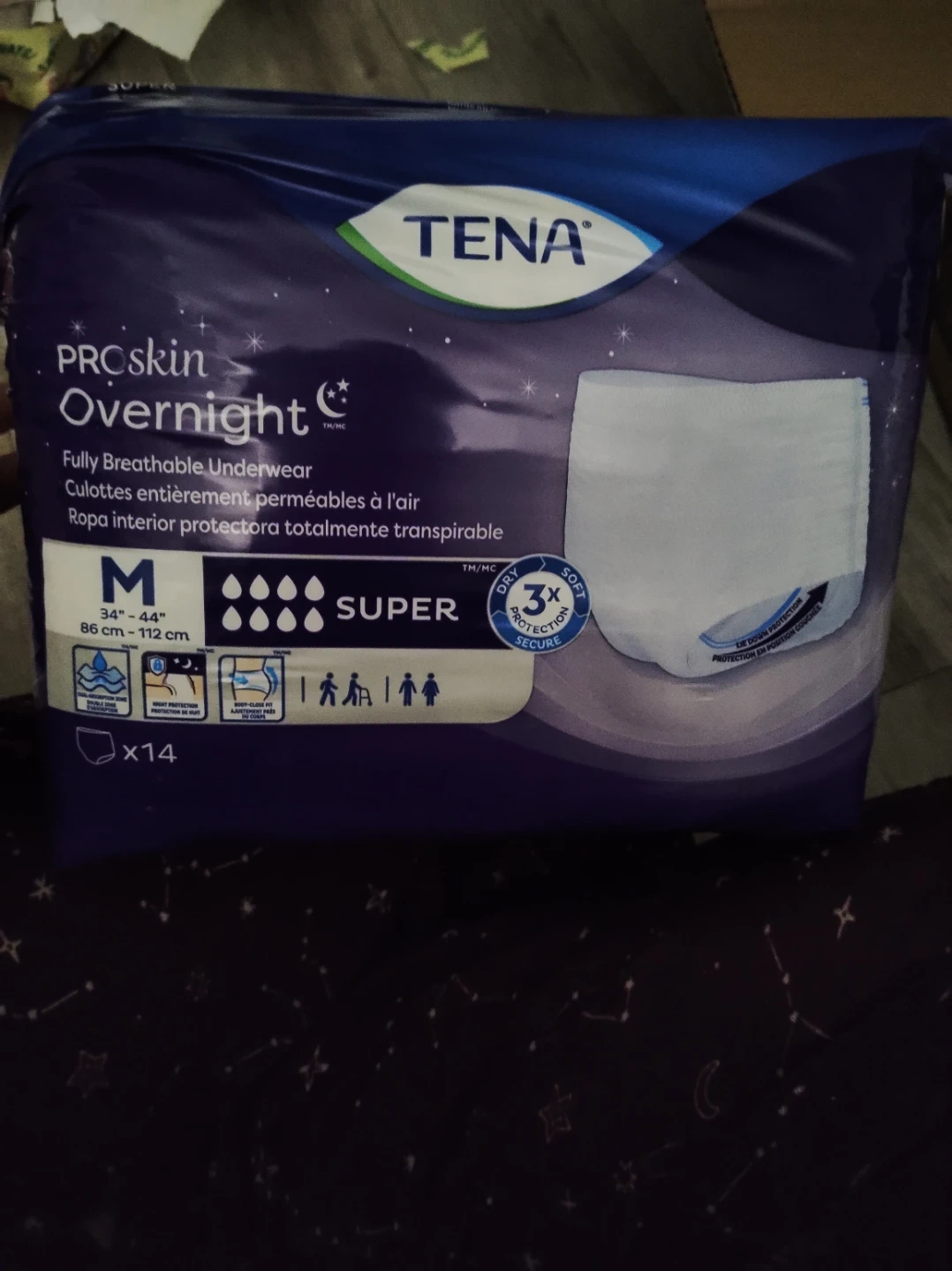 I have some TENA ProSkin Overnight underwear available in size medium (34"-44" / 86cm-112cm). These are fully breathable and designed for overnight use. Each pack contains 14 pairs