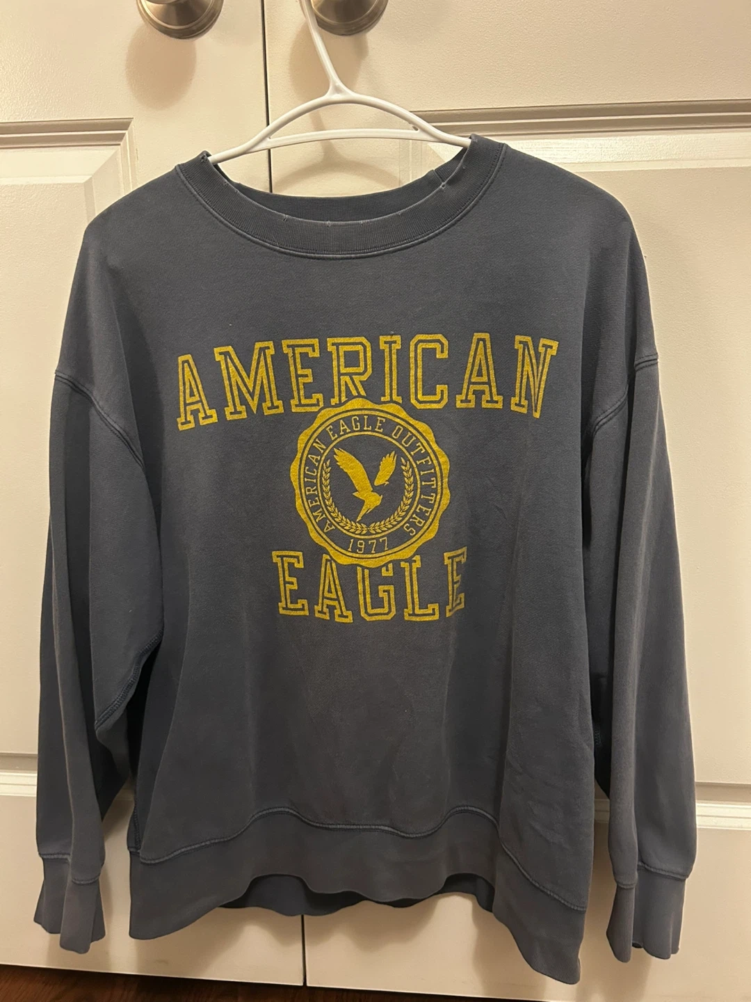 Selling an American Eagle Outfitters crewneck sweatshirt. It has a vintage-inspired design with the brand's logo and "1977" printed on the front. The colour is a faded grey-blue, and it's in great condition!
