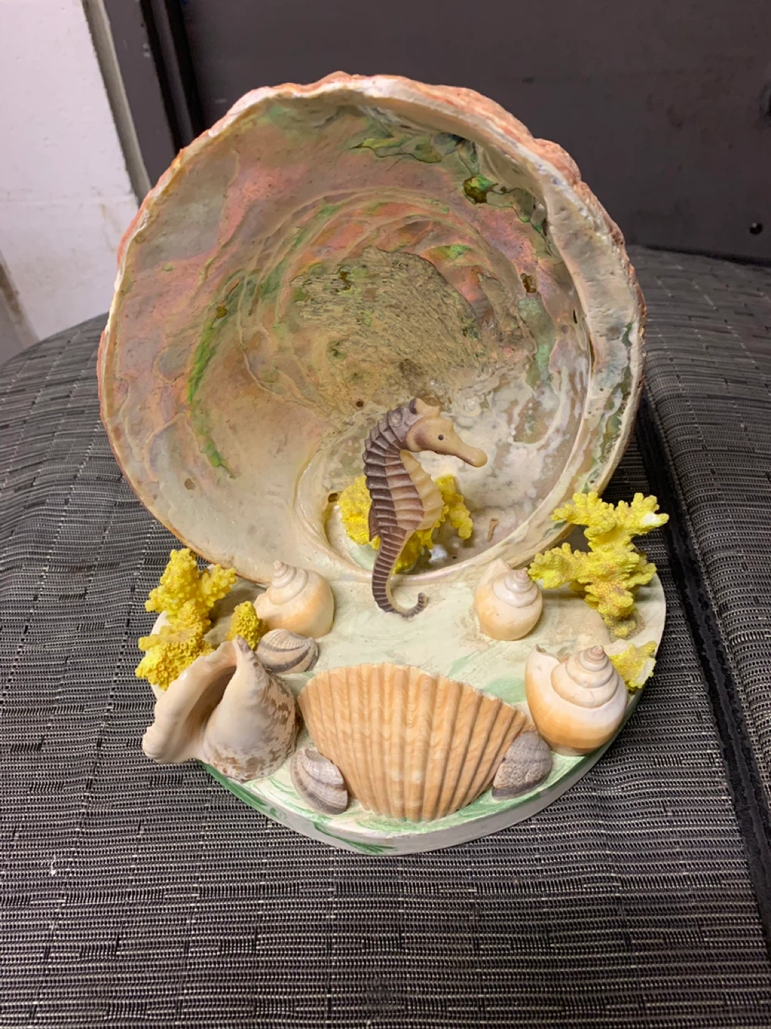 This is a unique seashell diorama featuring a seahorse figurine and other decorative shells. It's a charming piece that would add a touch of coastal flair to any room. The diorama is in good condition and ready to be displayed!
