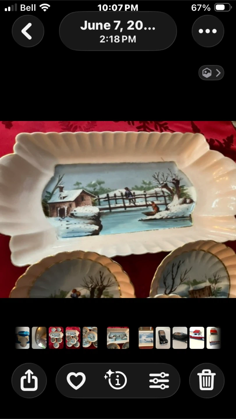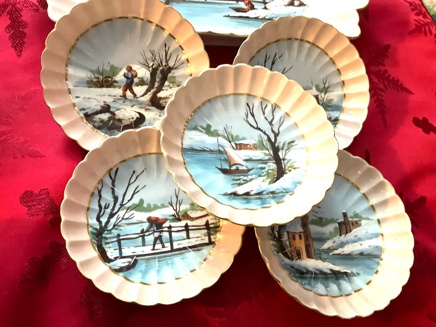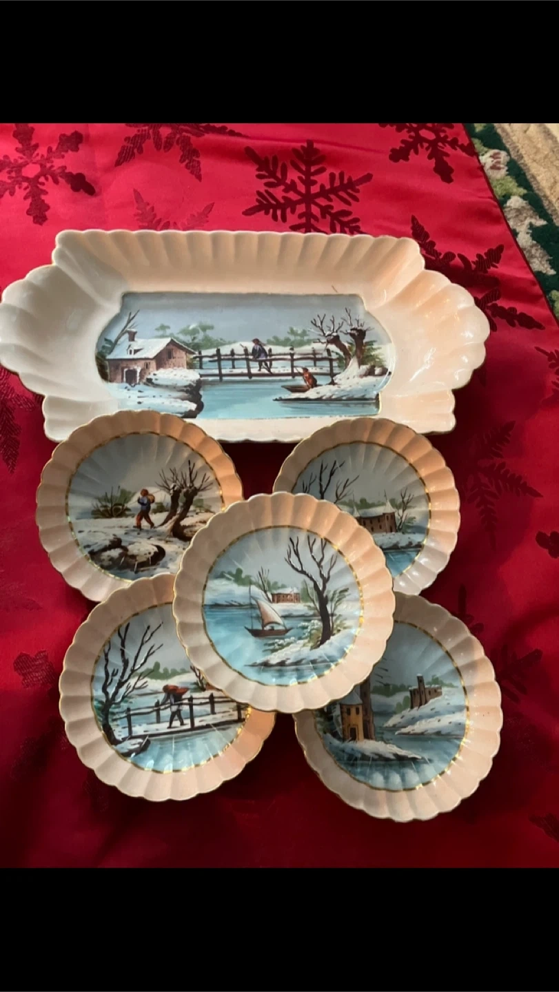 lovely vintage serving set featuring a charming winter scene. Includes a serving tray and five small plates, all in excellent condition was never used was on show