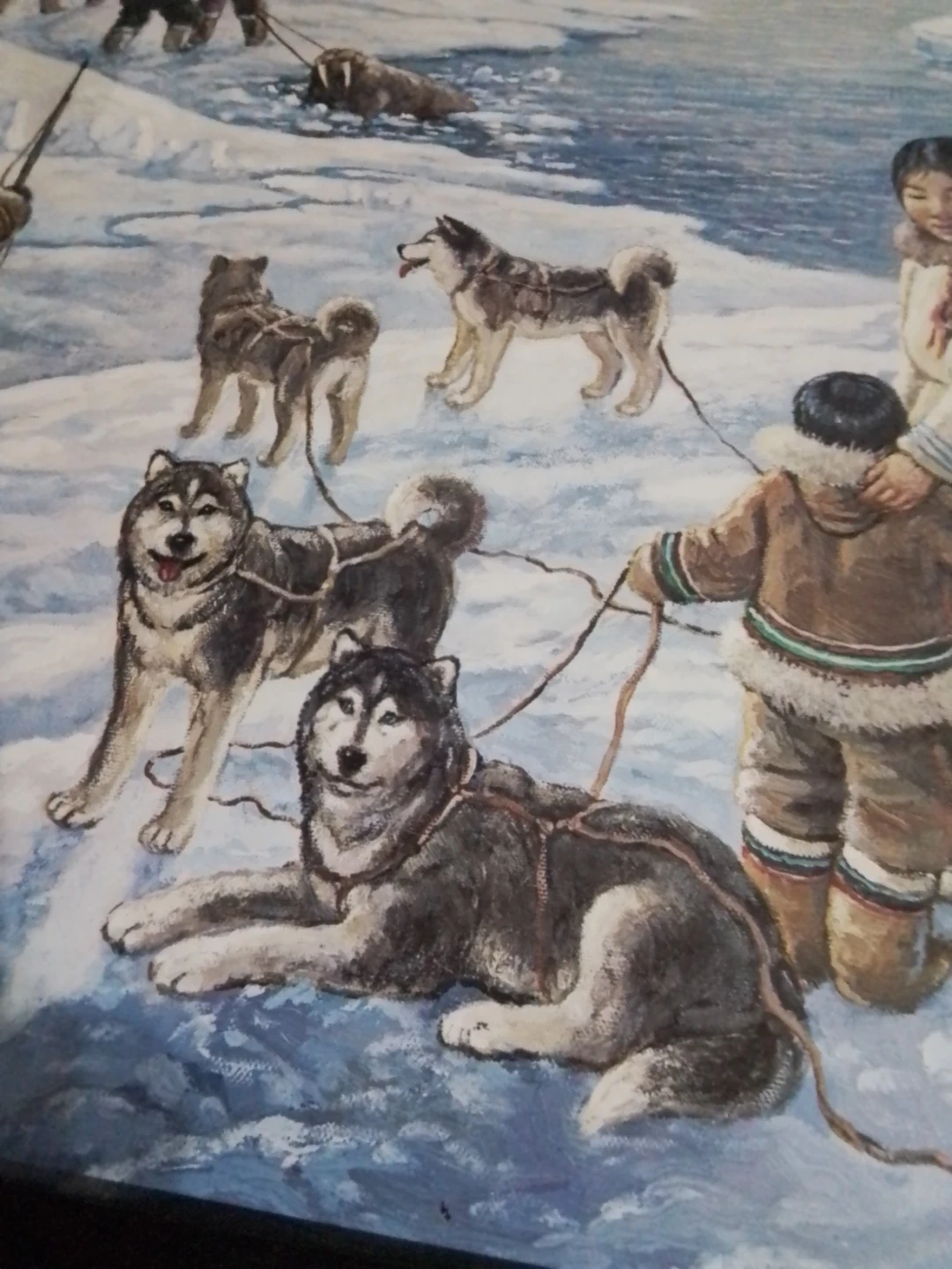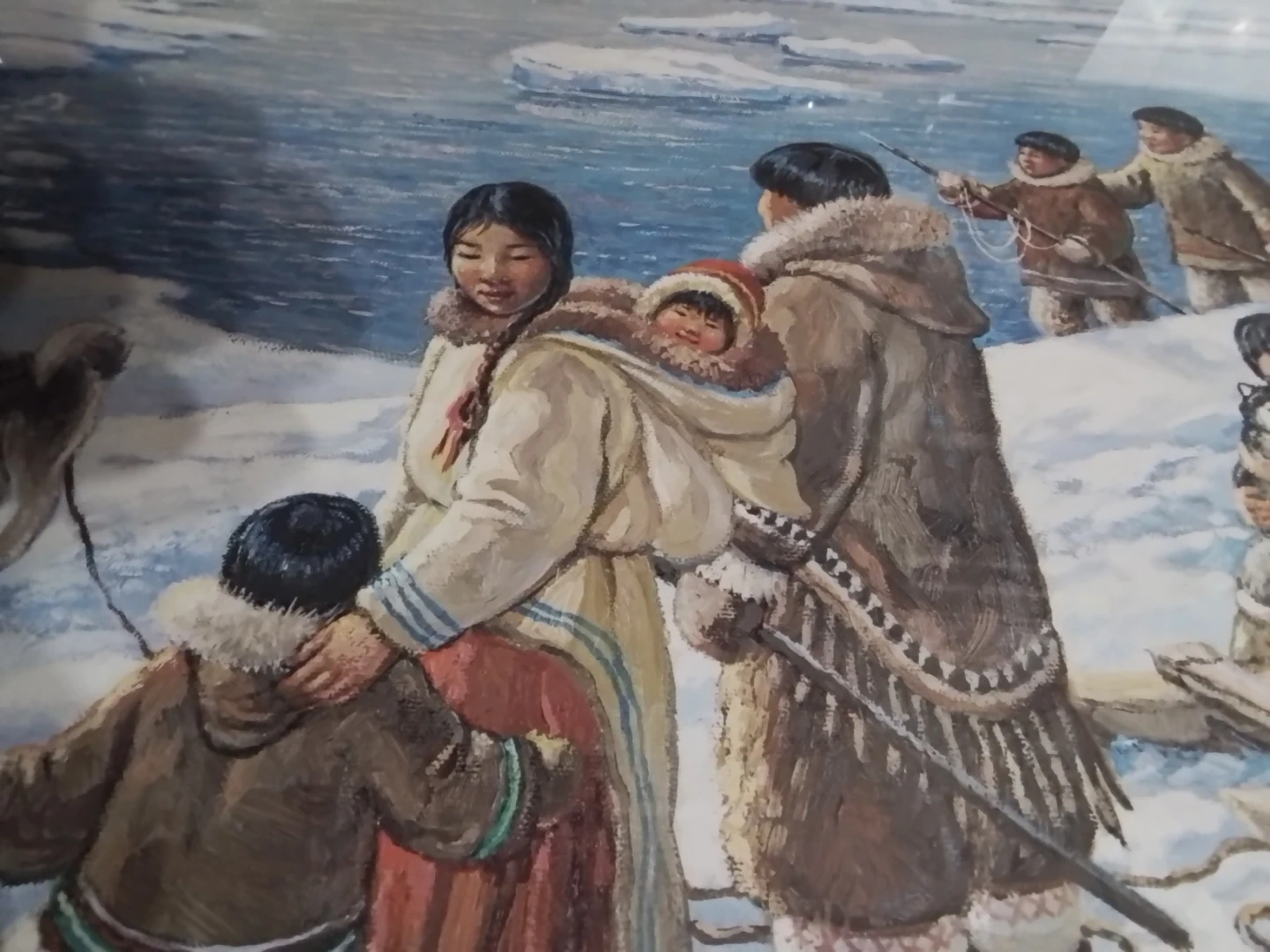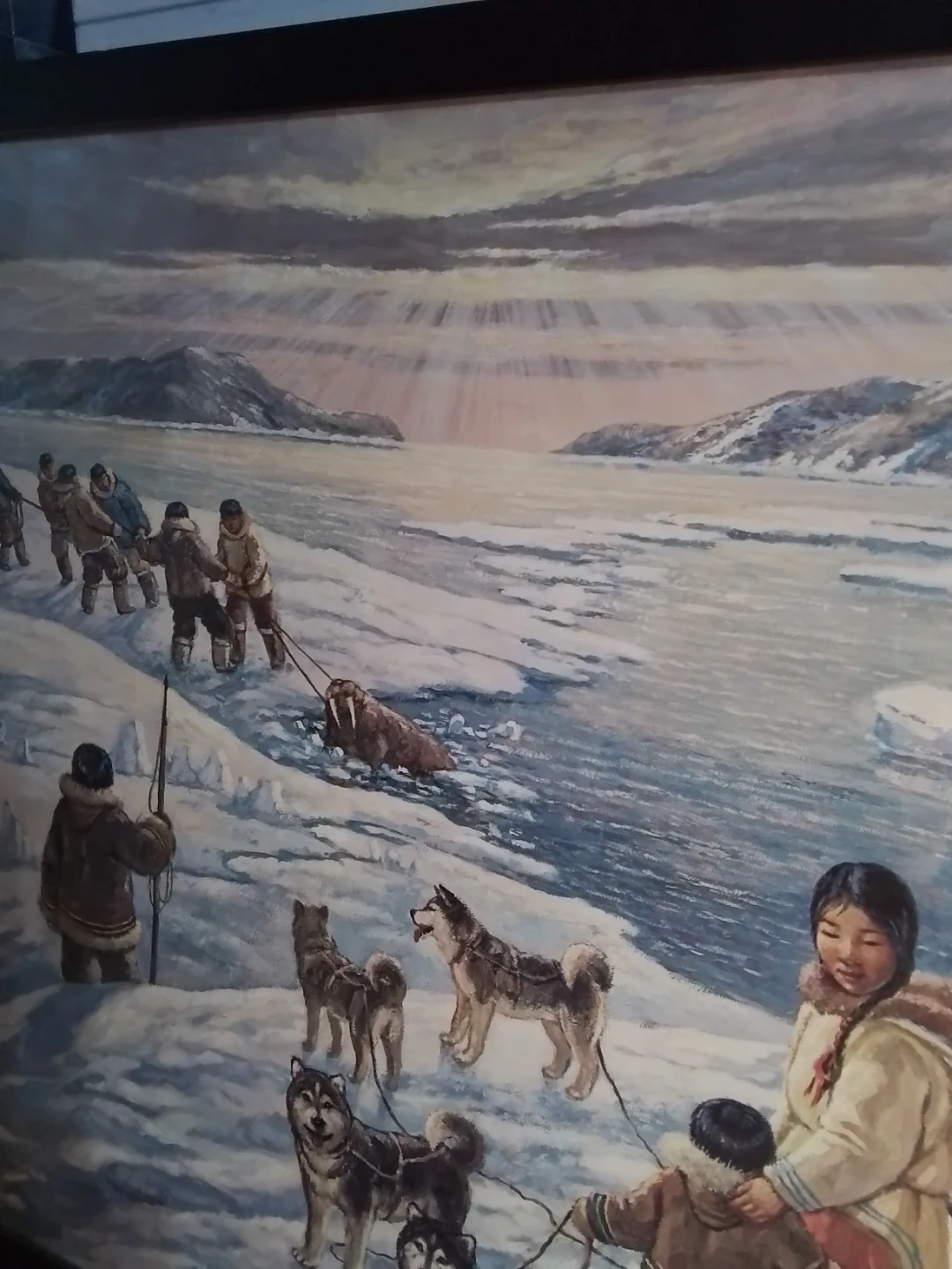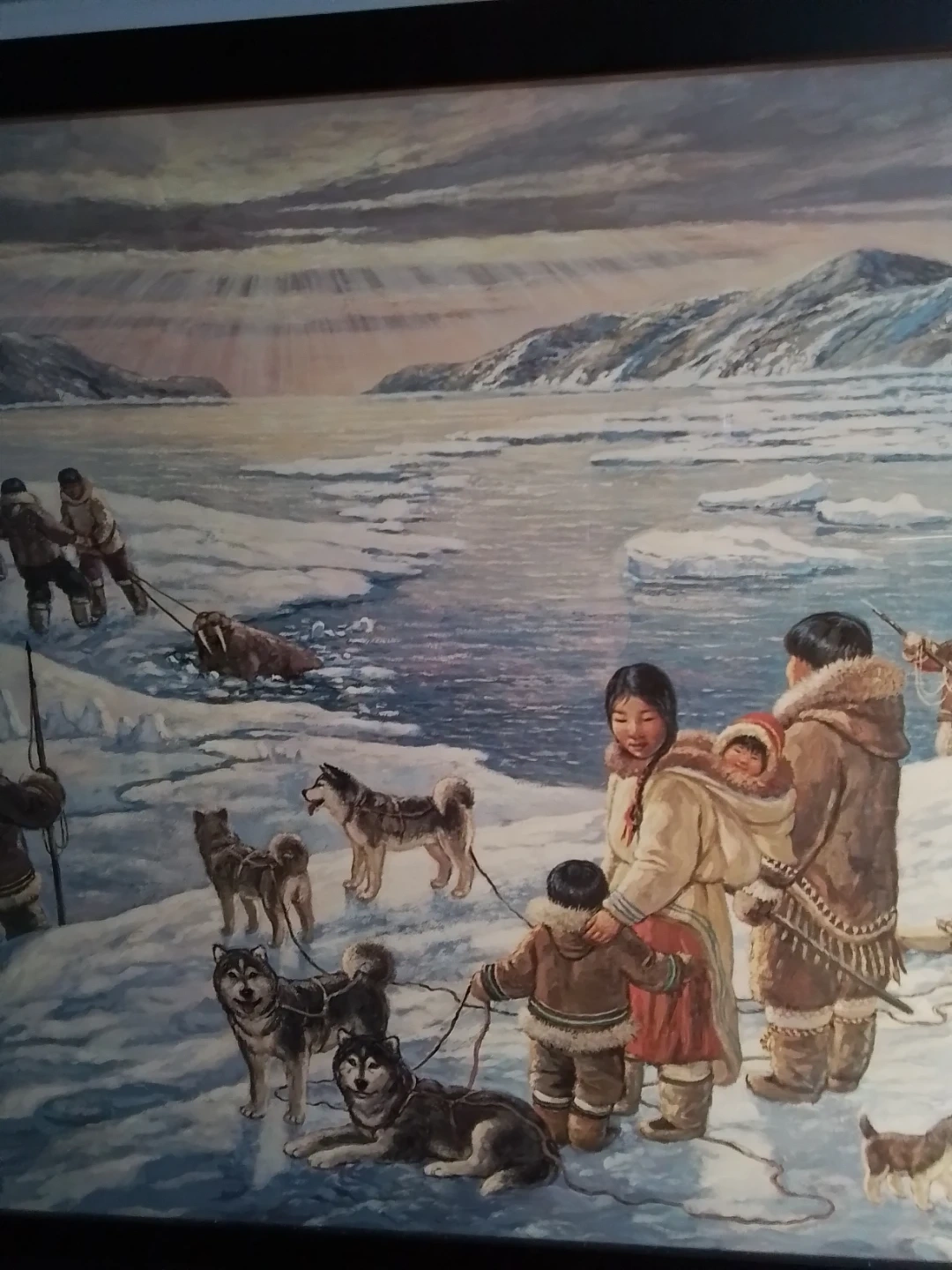 This is "The Providers" by Nori Peter, a captivating piece measuring 26 x 31.75 inches, beautifully framed and personally signed by the artist. The artwork portrays a vivid scene of Inuit life, showcasing a traditional walrus hunt amidst a stunning Arctic landscape. Please note that this artwork is used, adding to its unique character and history.