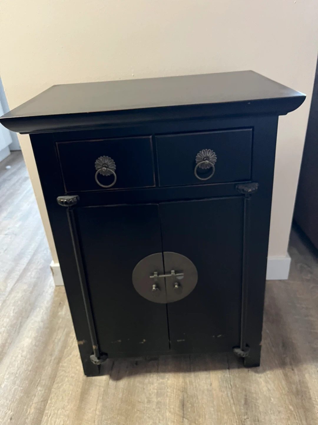 Selling a black cabinet with Asian-inspired design. It has two drawers at the top and a cabinet with a round metal latch. There are some signs of wear on the bottom, as shown in the pictures.