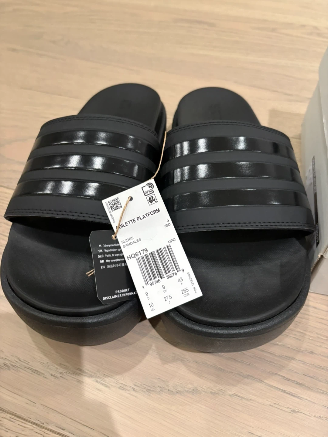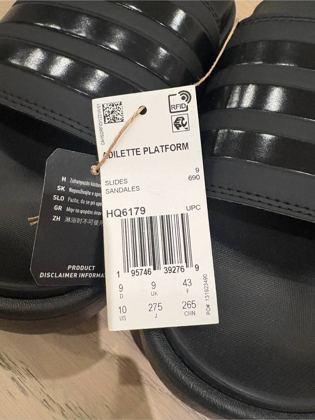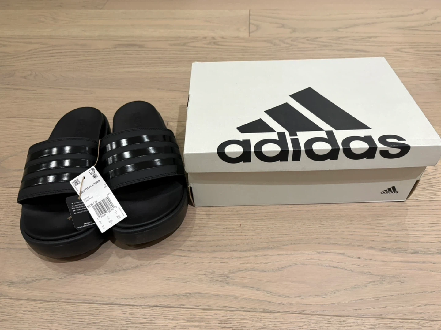 Selling a pair of Adidas Adilette Platform slides in US size 10. They are in brand new condition and come with the original box!