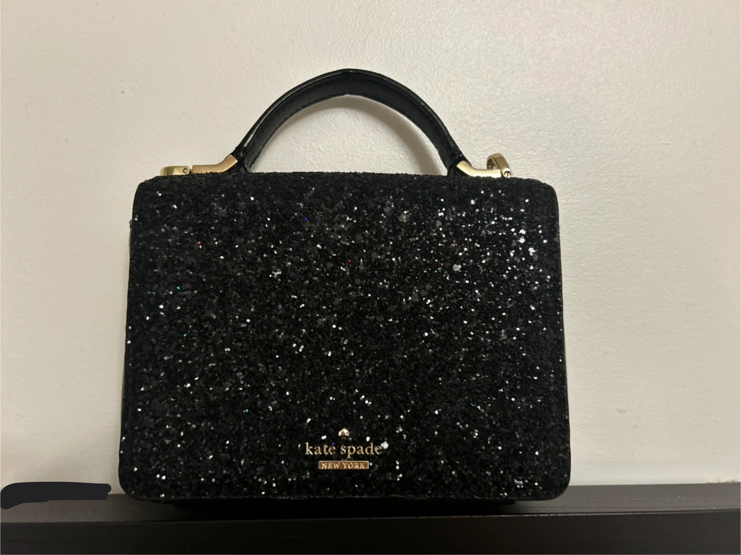 Selling a Kate Spade New York handbag in black glitter. It's in perfect conditions! It features a chain strap and a top handle. DM for more pictures!!!