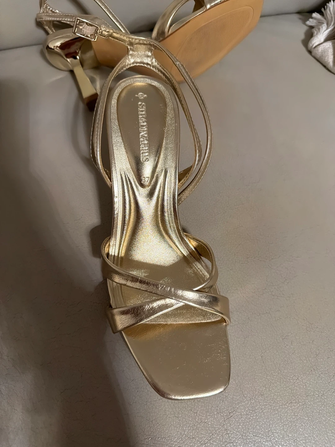 Selling a pair of Stradivarius gold heels in size 37. They're in great condition and would be perfect for a night out or a special occasion. The gold colour is really eye-catching and the heel height is just right!