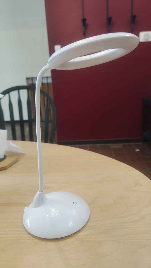 This is a used rechargeable desk lamp with a flexible gooseneck and adjustable brightness, perfect for any workspace. Its sleek design and portability make it a great addition to any room.