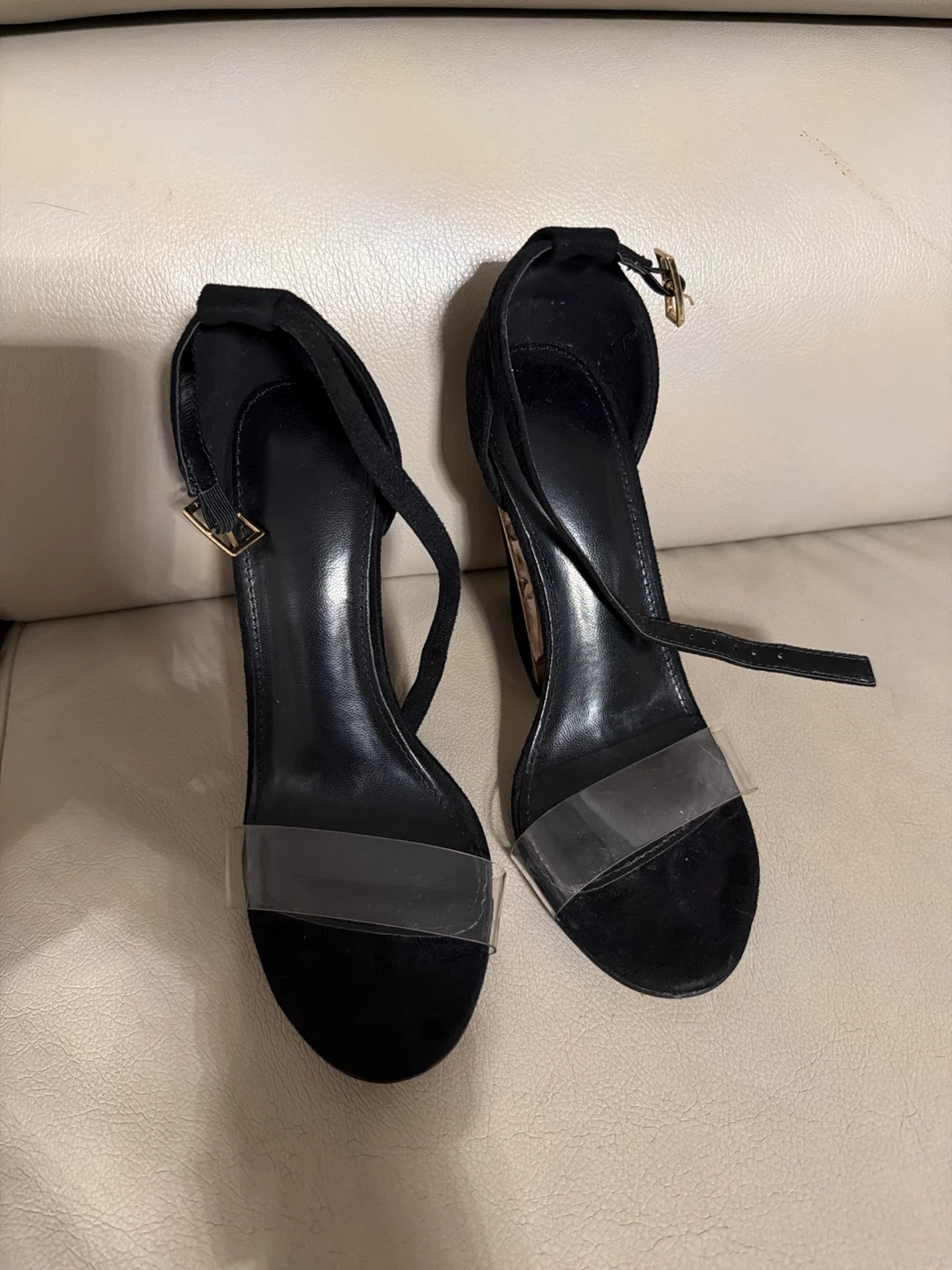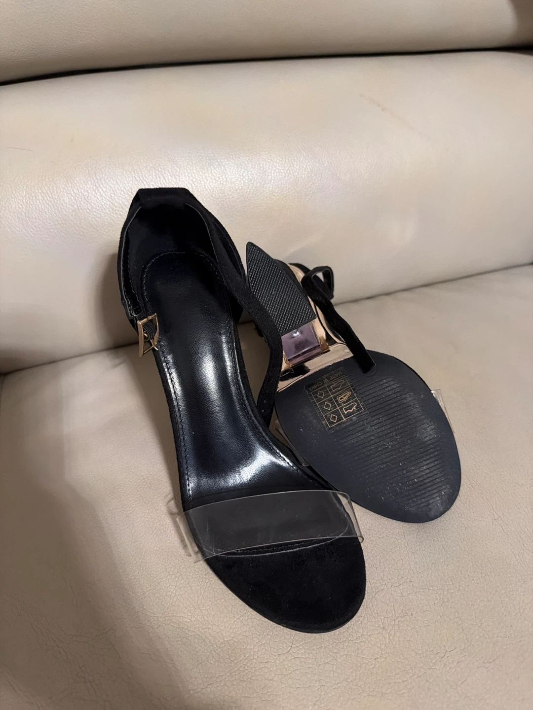 These minimalist black sandals feature a clear strap and a unique wedge heel design. They're perfect for adding a touch of modern style to any outfit!