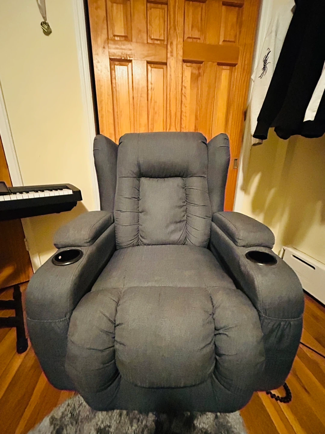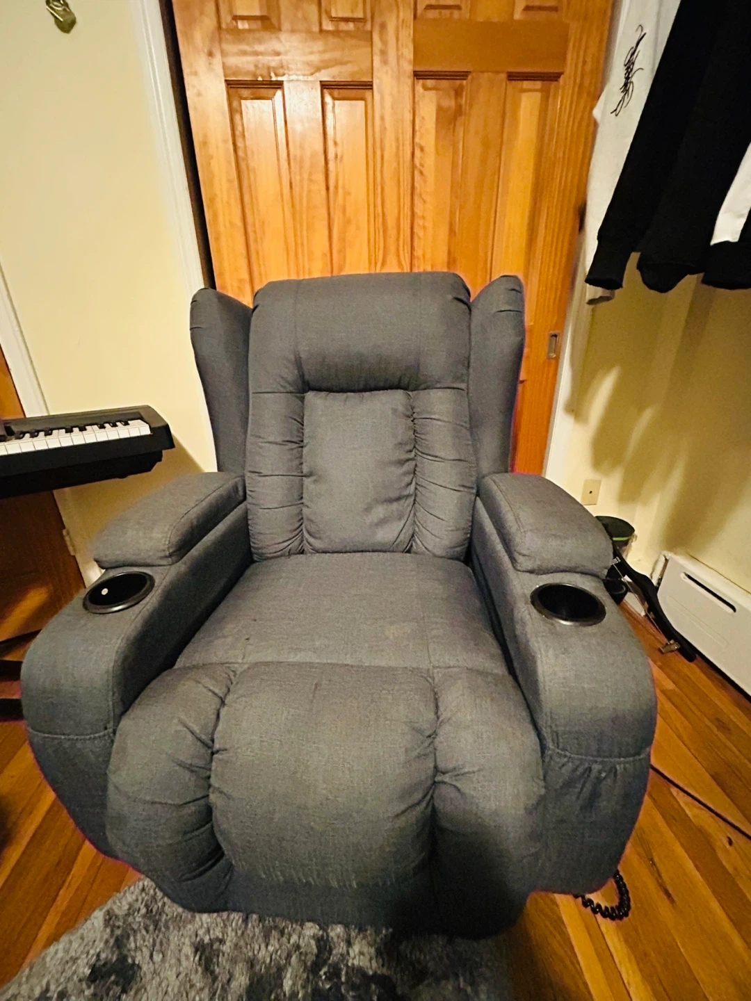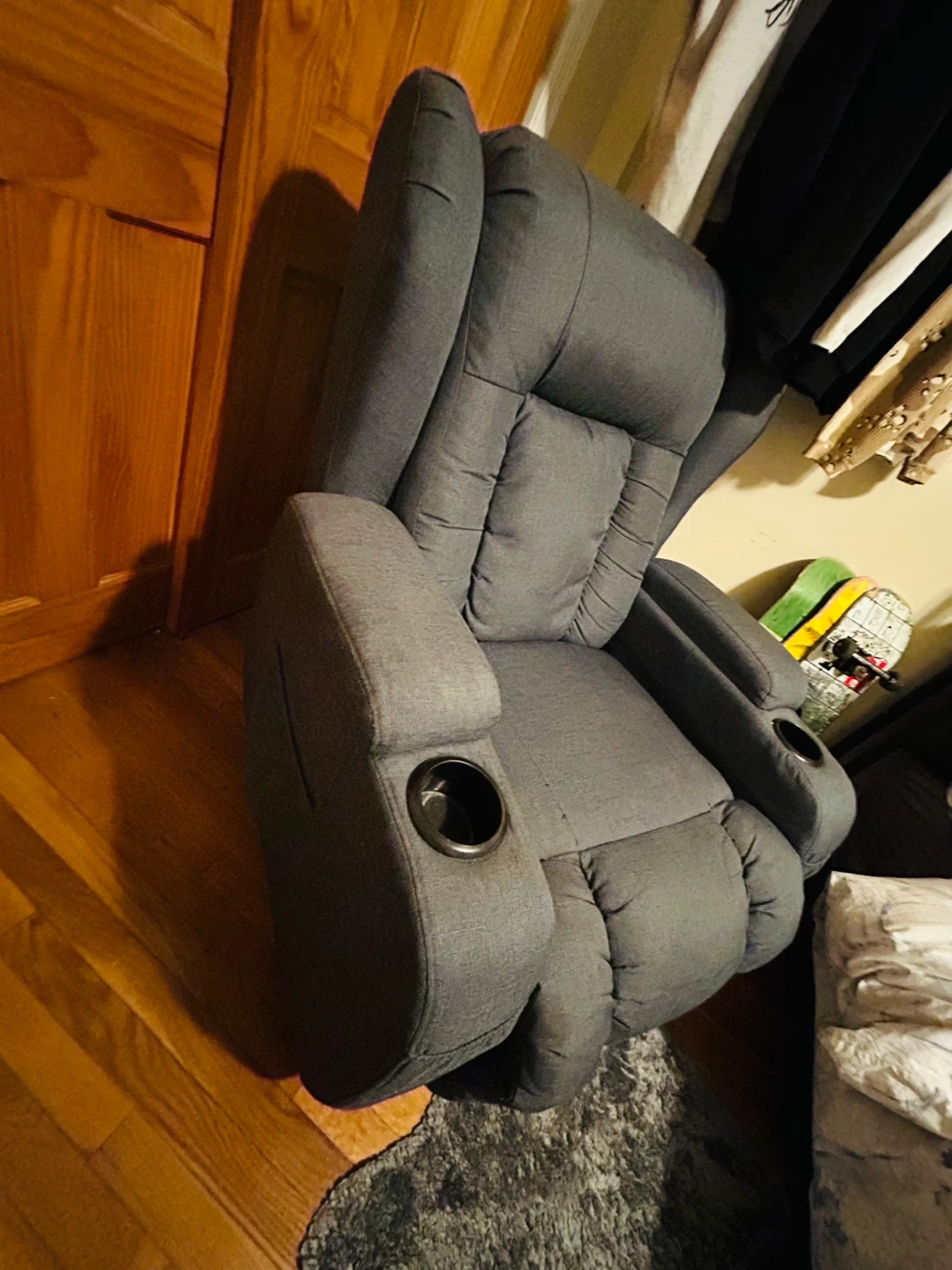 Selling a comfy blue recliner chair! It's perfect for relaxing and watching TV. It also features convenient cup holders on both sides, so you can keep your drink close by. It's in good condition and ready for a new home!