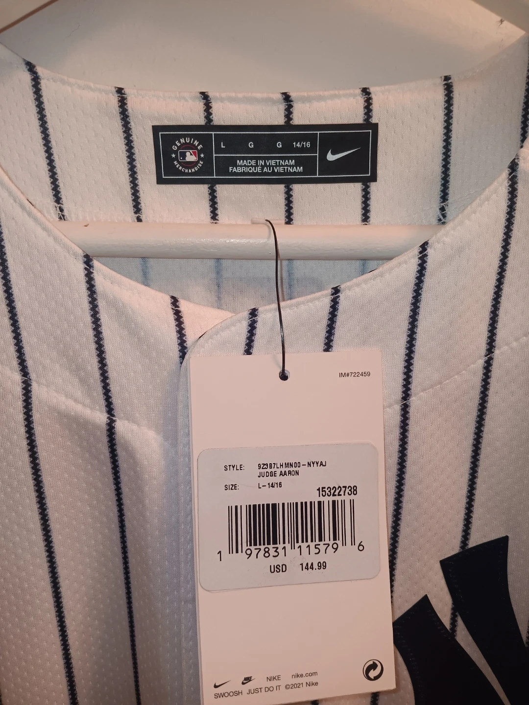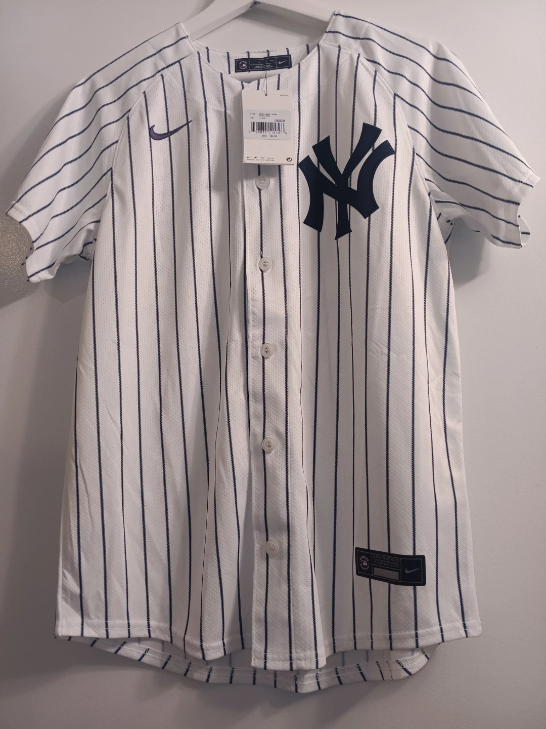 Selling a brand new New York Yankees Aaron Judge jersey in size L (14/16). It has the classic pinstripe design and the iconic Yankees logo. The jersey is made by Nike and still has the original tag attached.