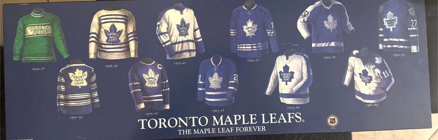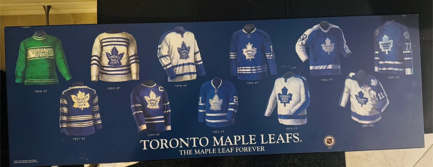 Selling a framed print showcasing the history of the Toronto Maple Leafs jerseys. It's a great piece for any Leafs fan to display. amazing collection piece