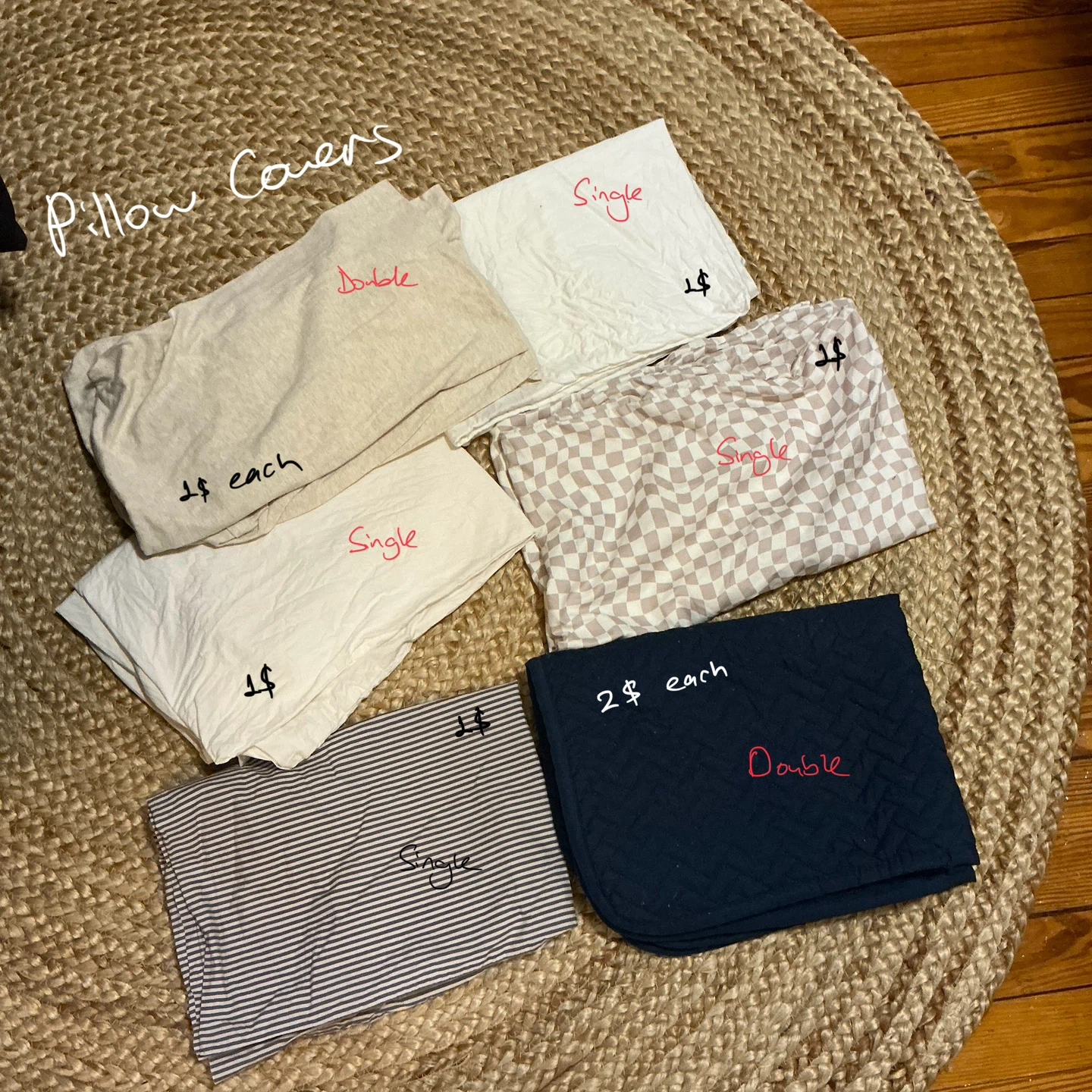 I have a variety of pillow covers available! There are single and double sizes. The single pillow covers are $1 each, and the double pillow covers are $2 each