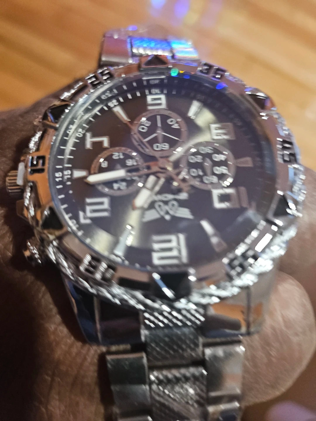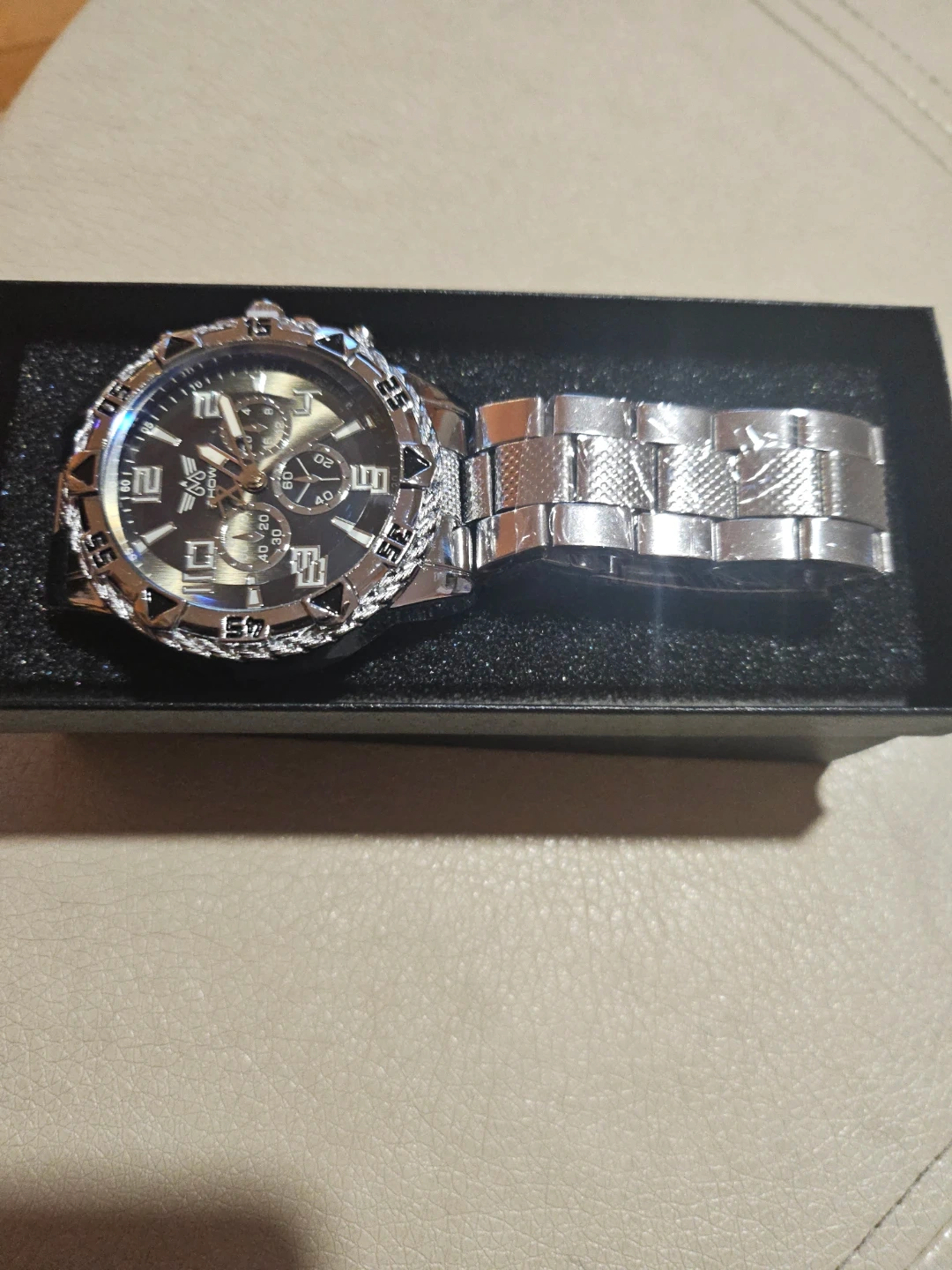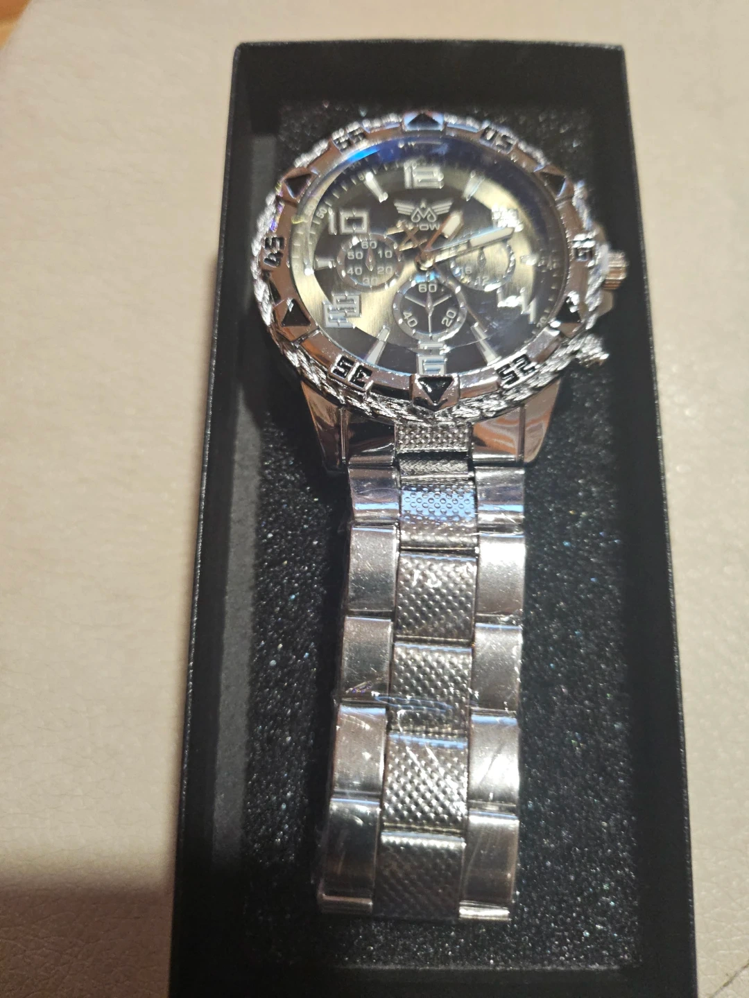 Selling a used Knight men's watch. It comes with its original box. The watch is silver in color and has a black face. It has a chronograph function.