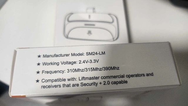 I'm selling a new Universal Remote Garage Door Opener, model SM24-LM, with a working voltage of 2.4V-3.3V and frequency of 310Mhz/315Mhz/390Mhz. It is compatible with Liftmaster commercial operators and receivers that are Security + 2.0 capable.