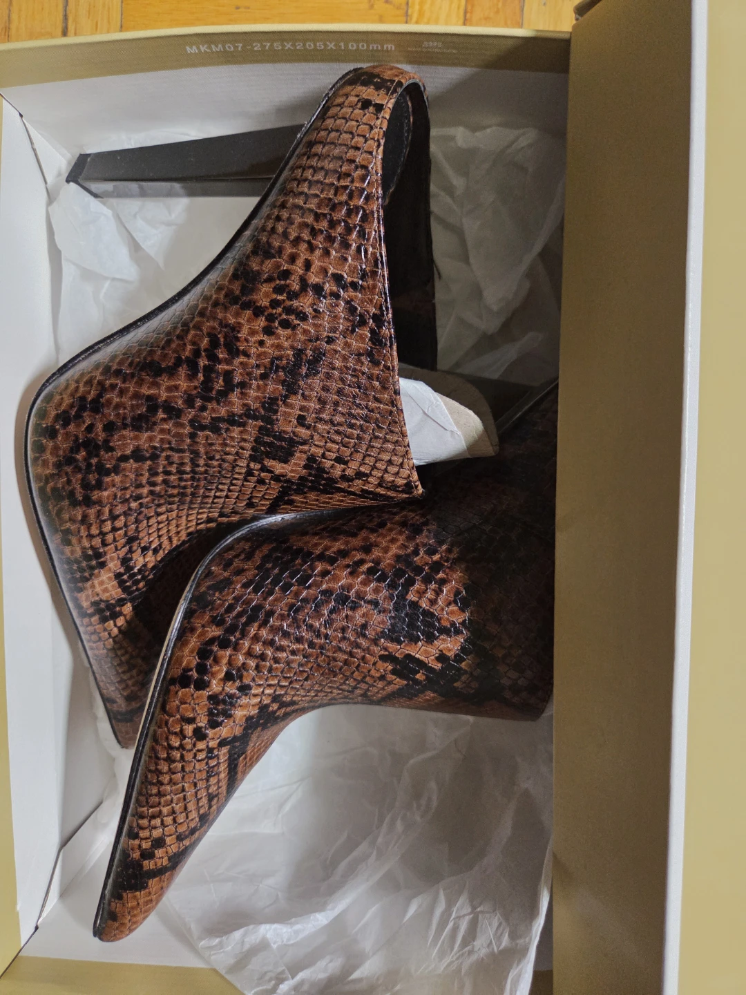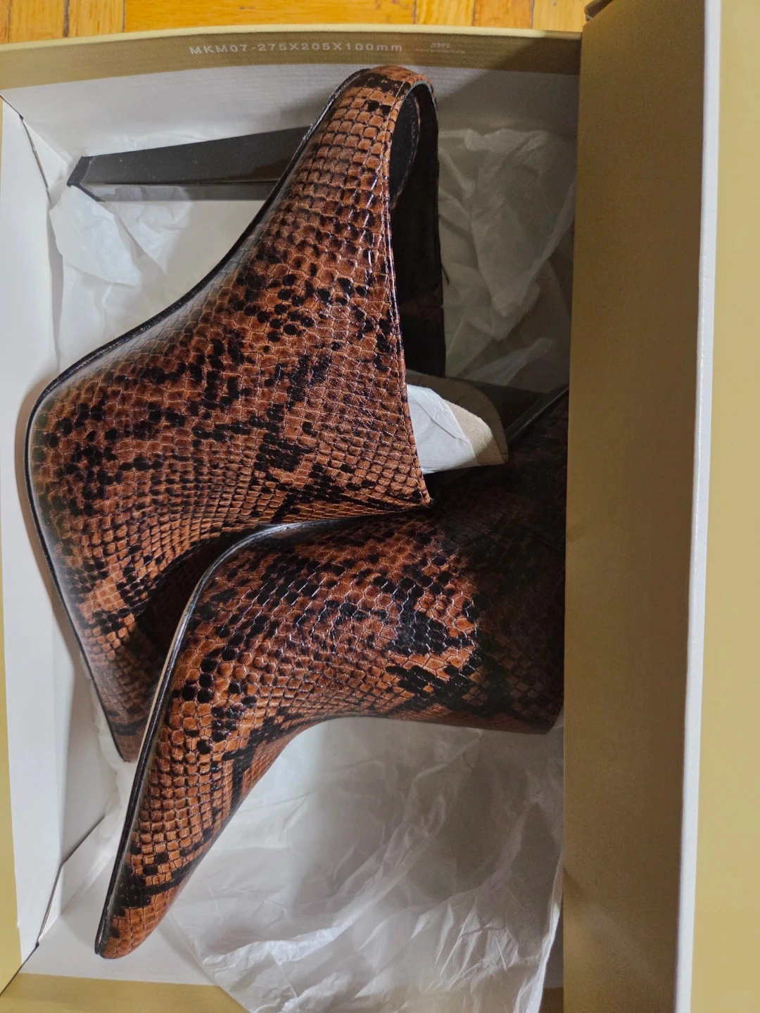 Selling a pair of new Michael Kors heels in a snakeskin pattern. They are a size 7 and come in the original box! They have a unique silver mirror heel. Regular price 328 plus tax. The mirror heel design is particularly striking and they look stunning and elegant on the foot. For ladies who can walk in heels, they are very attractive and look especially flattering. (This whole line has high reviews.)