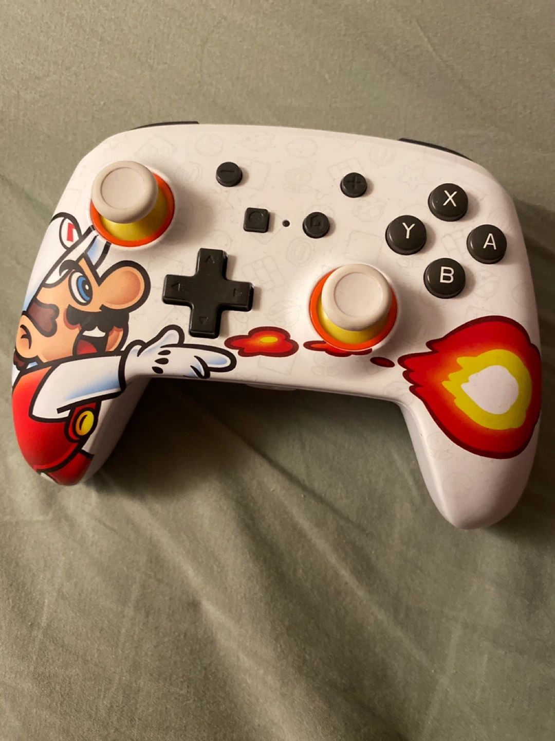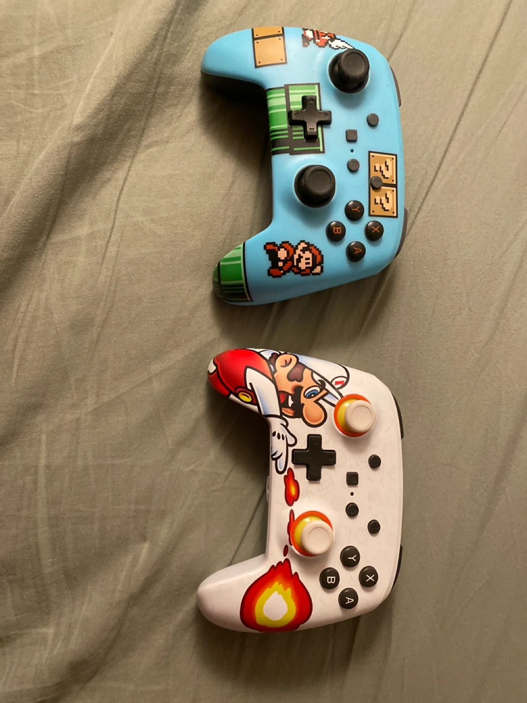 Two PowerA Enhanced Wireless Controllers for Nintendo Switch featuring Super Mario designs! One is a light blue colour and the other is white. Both may have minor, fixable drift and do not come with wires other than that good condition, light and easy to use