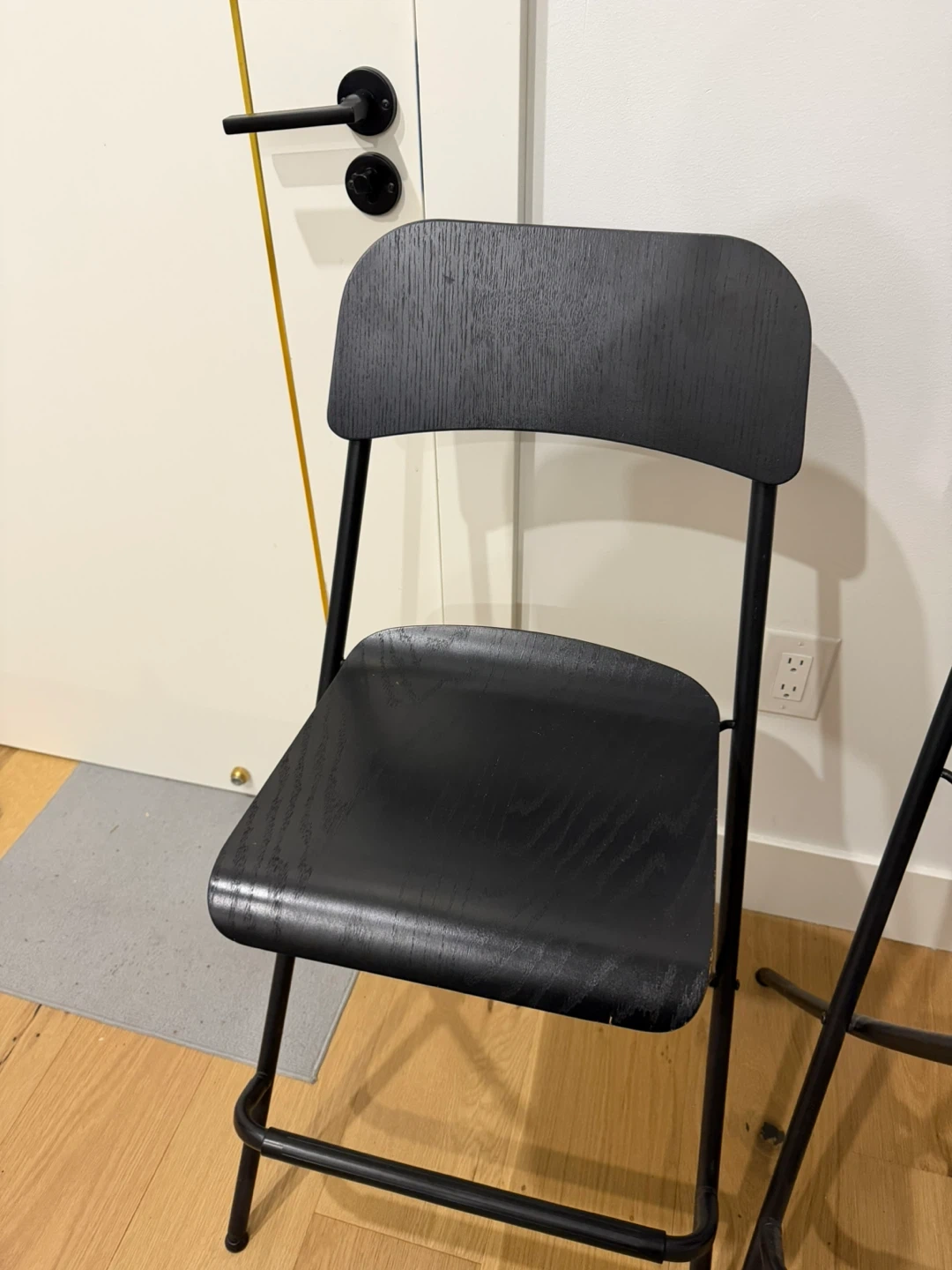 Selling a set of black folding chairs and a bar stool. They're in good condition and ready for a new home! Perfect for extra seating or a small space