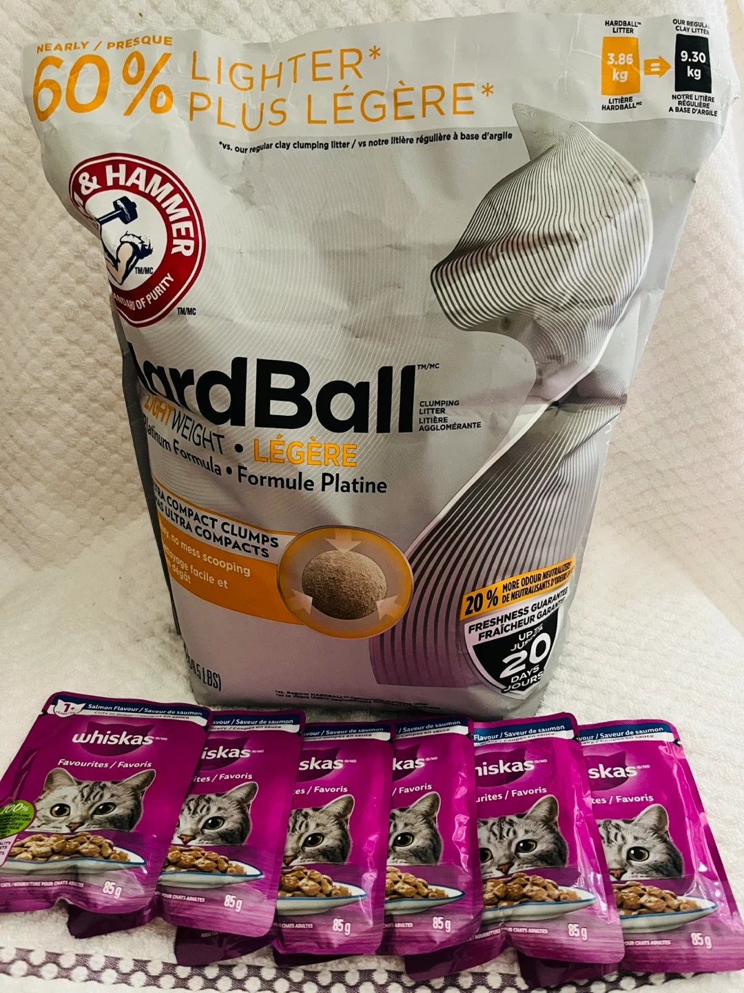 1 bags of ARM & HAMMER Hardball Clumping Litter 3.86kg and 6 bags of cat foods 85g/ea