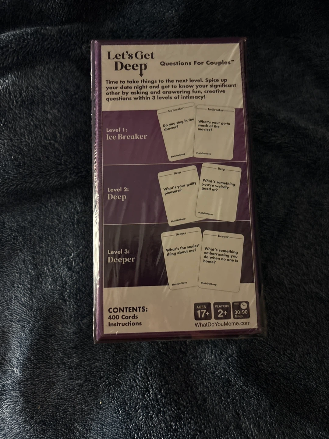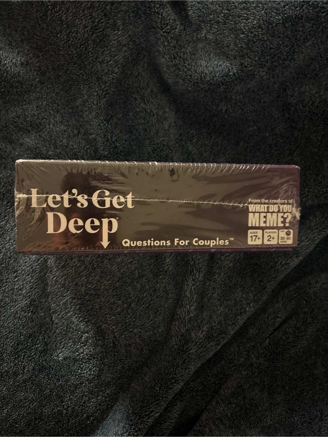 Selling a brand new, sealed copy of Let's Get Deep Questions For Couples game! This is a fun way to spice up date night and get to know your significant other. The game includes 400 cards and instructions, with questions across 3 levels: Ice Breaker, Deep, and Deeper. Recommended for ages 17+ and for 2+ players.