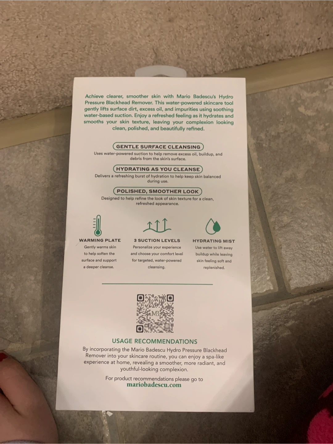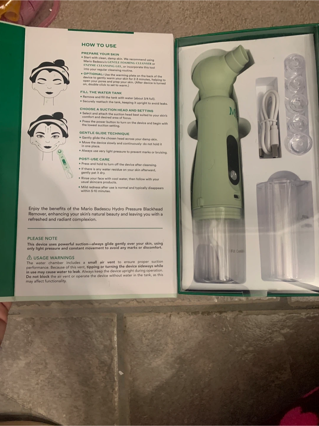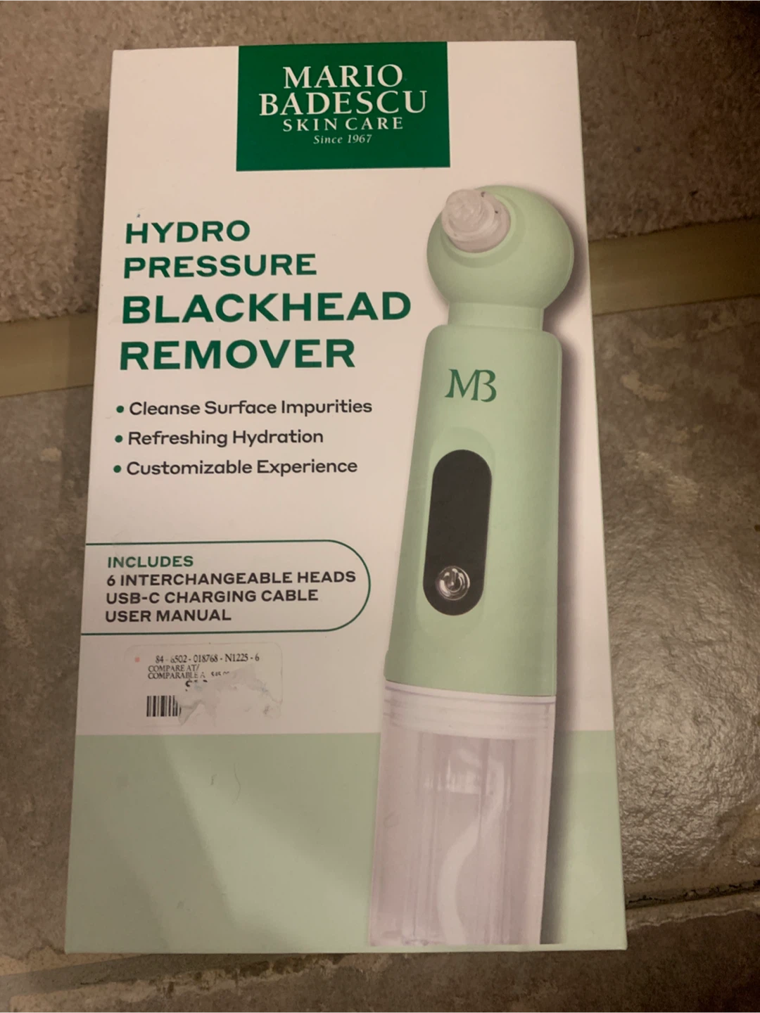 Selling a Mario Badescu Hydro Pressure Blackhead Remover. It cleanses surface impurities and provides refreshing hydration. It also has a customizable experience. It includes 3 interchangeable heads, a USB-C charging cable and a user manual. It also uses water to lift away buildup while leaving skin feeling soft and replenished