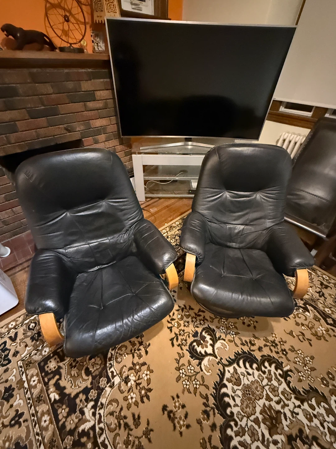 Selling a set of two comfy black leather armchairs. They're in good condition and would look great in any living room or den. Perfect for relaxing after a long day!