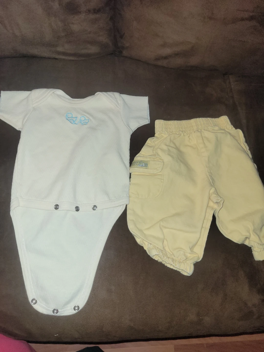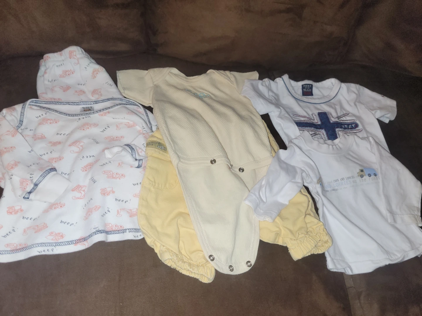This pre-loved bundle of baby / doll outfits includes a mix of items perfect for a little one aged approximately 0-6 months. The collection features various pieces such as onesies, shirts, and pants, all in good, used condition. These clothes are adorable and ready for a new home! I'm pricing this bundle at $ 3. What a steal!
