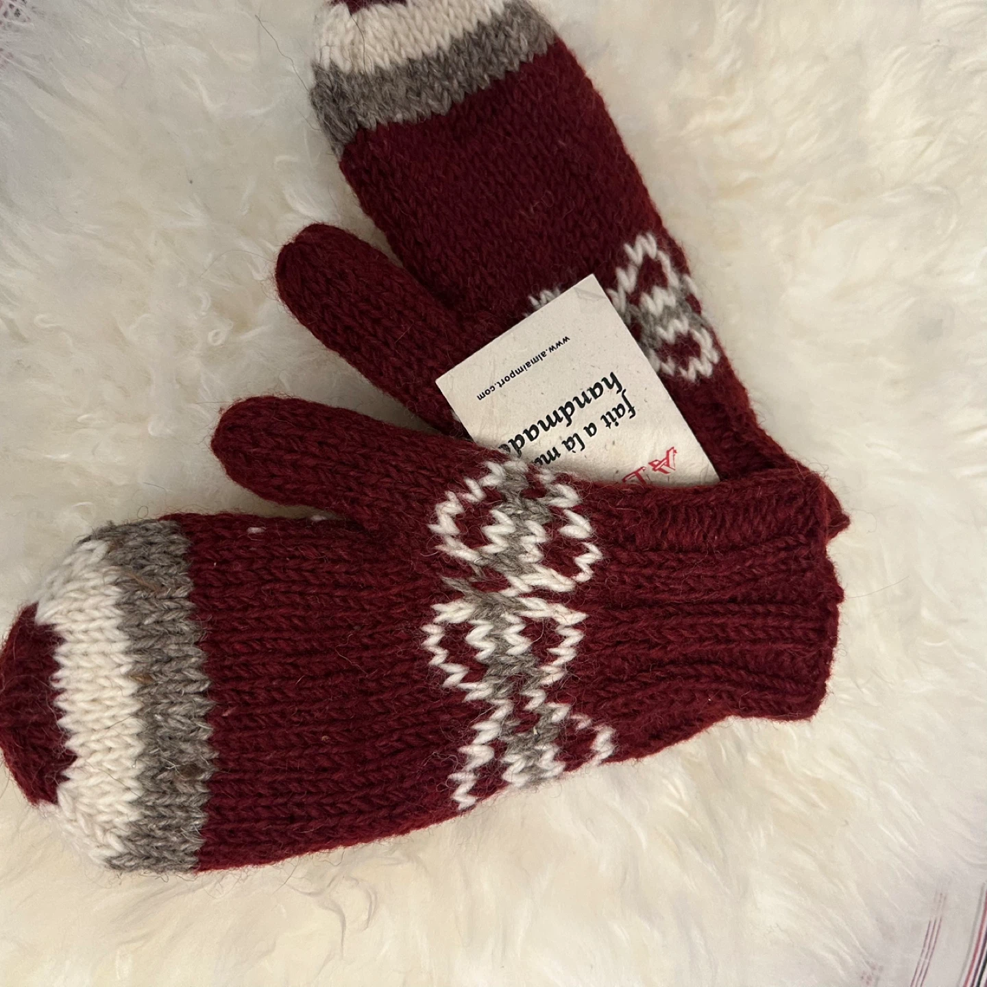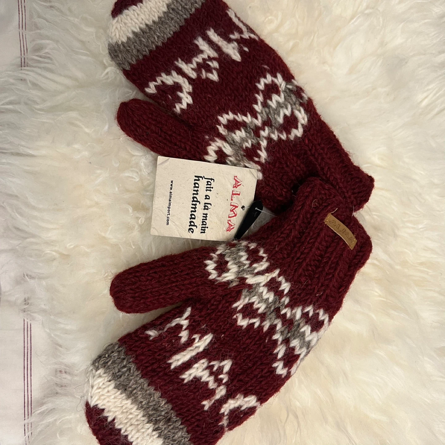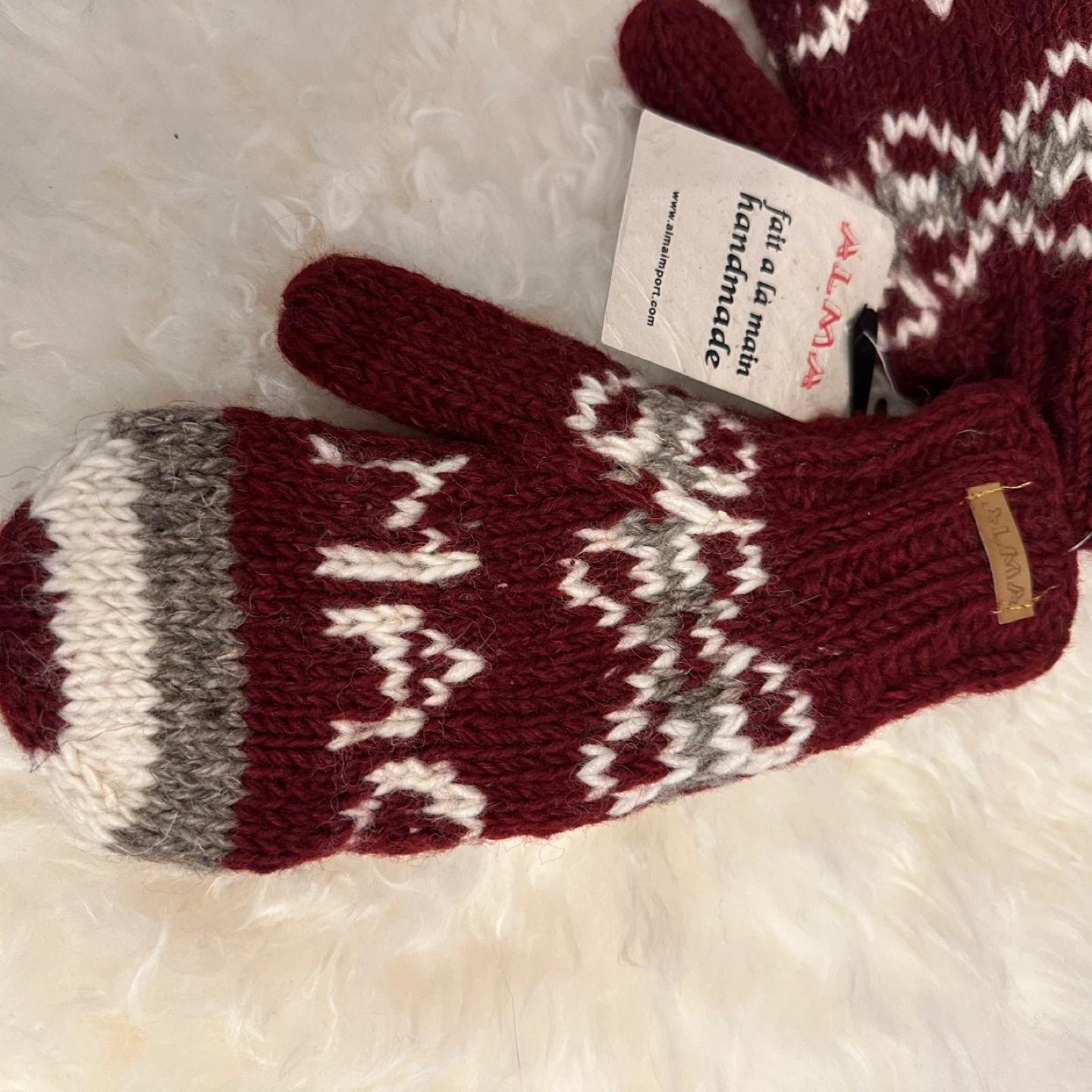 Keep your hands warm with these beautiful Alma handmade mittens! They feature a lovely burgundy and grey colour scheme with a unique pattern. Perfect for those chilly Canadian winters!