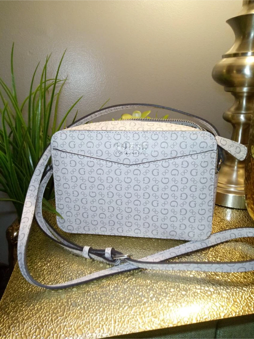 This Guess crossbody bag features an all-over G logo print. It has a zip closure and an adjustable shoulder strap. Perfect for everyday use!