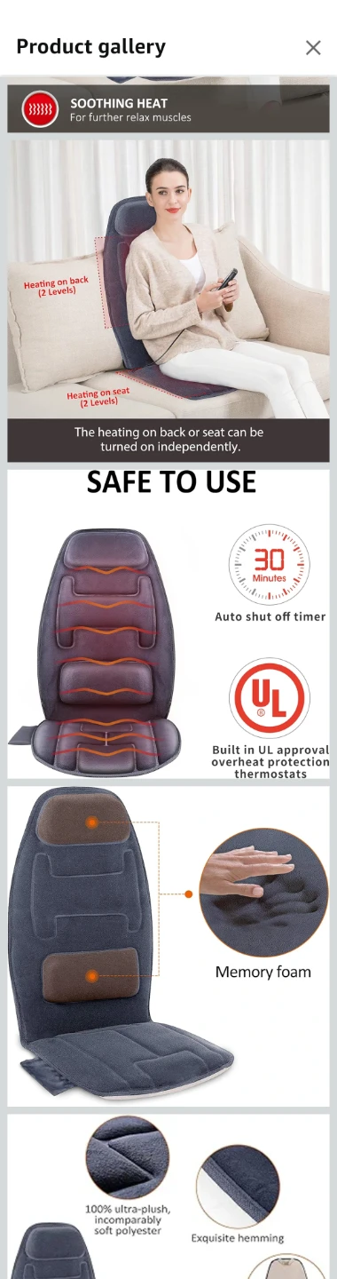 Indulge in relaxation with this Snailax massage seat cushion, designed with soft memory foam and 10 powerful vibrating motors for back and thighs, plus soothing heat. Featuring custom settings for neck, upper/lower back, and seat, it offers 5 programmed modes and 3 intensity levels. The heat function includes 3 heating pads with 2 levels and a 30-minute auto shut-off. This used cushion provides superior comfort and is perfect for soothing massages at home or in the office. Still available? Yes, it's here waiting for you!