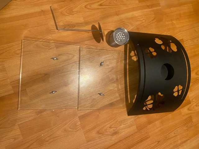 Modern bio ethanol fireplace insert. Black metal housing with clover cutouts. Includes glass panels and burner. Indoor and outdoor Easy installation.